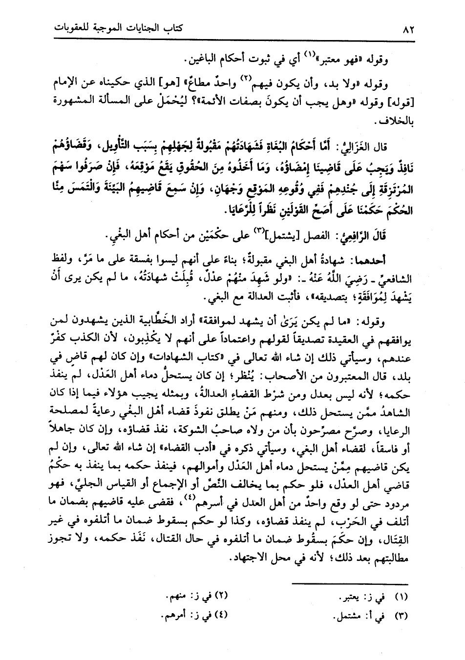 وقوله: "ما لم يكن يَرَى أن يشهد لموافقة" أراد الخَطَّابية الذين يشهدون لمن يوافقهم في العقيدة تصديقاً لقولهم واعتماداً على أنهم لا يكْذِبون؛ لأن الكذب كفْرٌ عندهم، وسيأتي ذلك إن شاء الله تعالى في "كتاب الشهادات" وإن كان لهم قاضٍ في بلد، قال المعتبرون من الأصحاب: يُنْظر؛ إن كان يستحلُّ دماء أهل العَدْل، لم ينفذ حكمه؛ لأنه ليس بعدل ومن شرْط القضاءِ العدالةُ، وبمثله يجيب هؤلاء فيما إذا كان الشاهدُ ممَّن يستحل ذلك، ومنهم مَنْ يطلق نفوذَ قضاء أهْل البغْي رعايةً لمصلحة الرعايا، وصرَّح مصرِّحون بأن من ولاه صاحبُ الشوكة، نفذ قضاؤه، وإن كان جاهلًا أو فاسقاً، لقضاء أهل البغي، وسيأتي ذكره في "أدب القضاء" إن شاء الله تعالى، وإن لم يكن قاضيهم مِمَّنْ يستحل دماء أهل العَدْل وأموالهم، فينفذ حكمه بما ينفذ به حكْمُ قاضي أهل العدْل، فلو حكم يما يخالف النَّصَّ أو الإجماع أو القياس الجليَّ، فهو مردود حتى لو وقع واحدٌ من أهل العدل في أسرهم (¬4)، فقضى عليه قاضيهم بضمان ما أتلف في الحَرْب، لم ينفذ قضاؤه، وكذا لو حكم بسقوط ضمان ما أتلفوه في غير القِتَال، وإن حكَمَ بسقُوط ضمان ما أتلفوه في حال القتال، نَفَذ حكمه، ولا تجوز مطالبتهم بعد ذلك؛ لأنه في محل الاجتهاد.