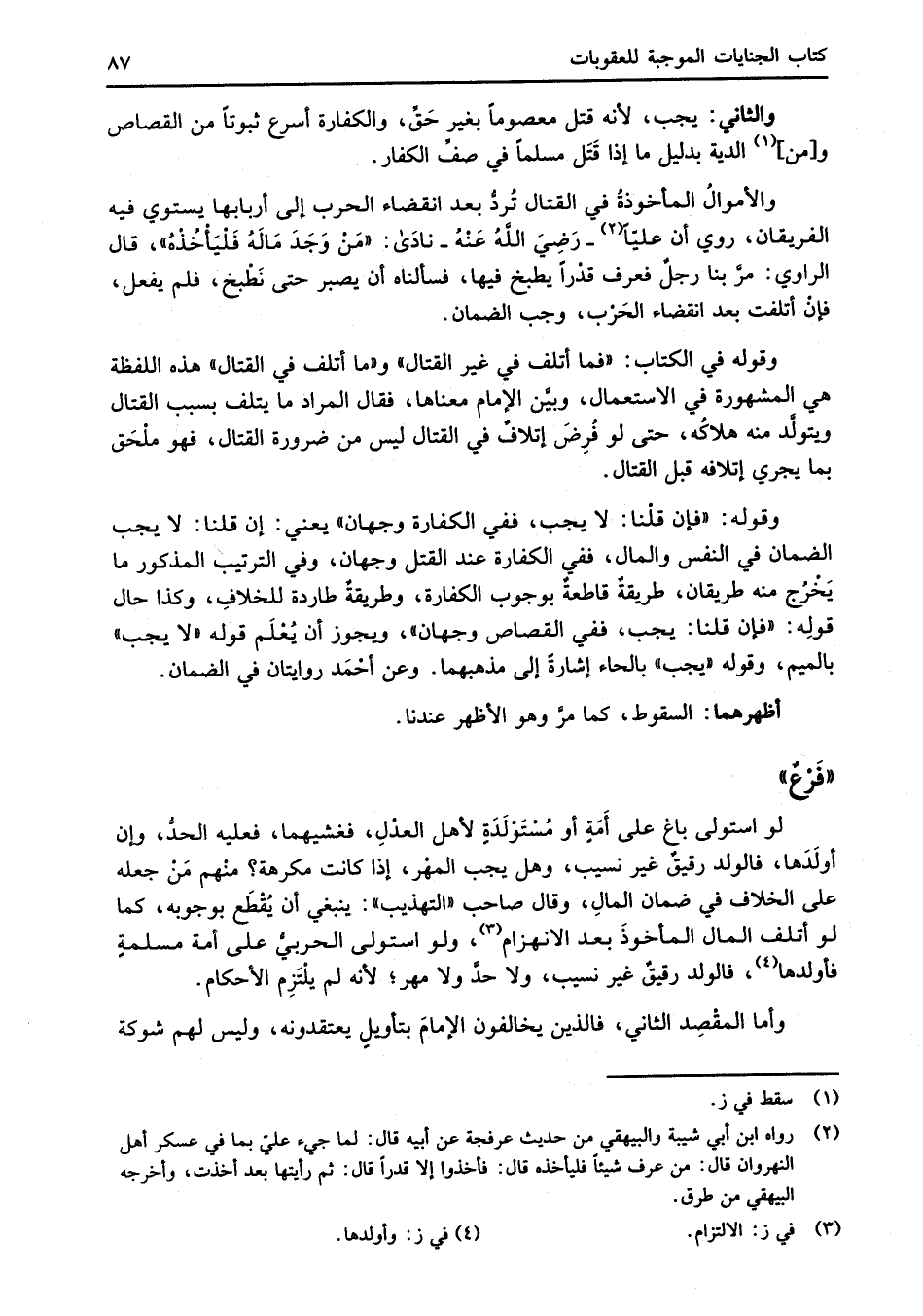 وقوله: "فإن قلْنا: لا يجب، ففي الكفَّارة وجهان" يعني: إن قلنا: لا يجب الضمان في النفس والمال، ففى الكفَّارة عند القتل وجهان، وفي الترتيب المذكور ما يَخْرُج منه طريقان، طريقةٌ قاطعةٌ بوجوب الكفَّارة، وطريقةٌ طاردة للخلافِ، وكذا حال قولِه: "فإن قلنا: يجب، ففي القصاص وجهان"، ويجوز أن يُعْلَم قوله "لا يجب" بالميم، وقوله "يجب" بالحاء إشارةً إلى مذهبهما. وعن أحْمَد روايتان في الضمان.