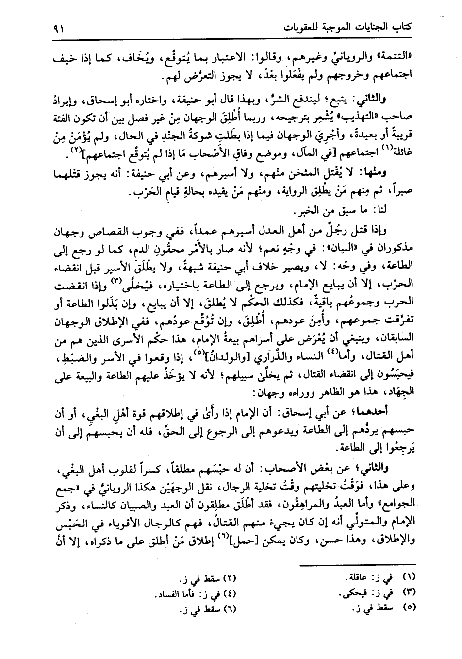 ومنْها: لا يُقْتل المثخن منْهم، ولا أسيرهم، وعن أبي حنيفة: أنه يجوز قتْلهما صبراً، ثم مِنهم مَنْ يطْلِق الرواية، ومنْهم مَنْ يقيده بحالةِ قيامِ الحَرْب.