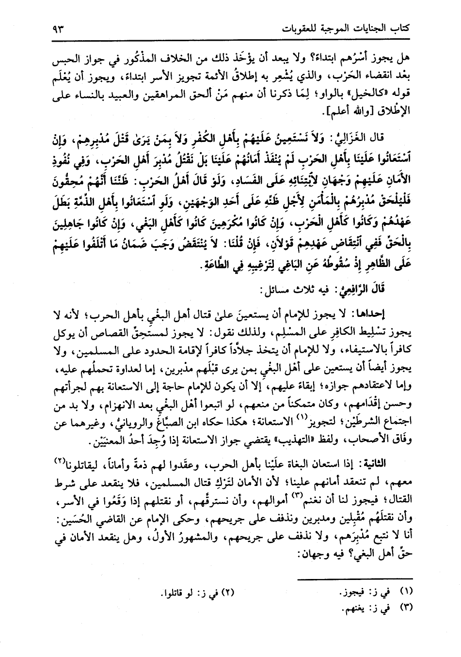 إحداها: لا يجوز للإمام أن يستعينَ على قتال أهل البغْيِ بأهل الحرب؛ لأنه لا يجوز تسْلِيط الكافِرِ على المسْلِم، ولذلك نقول: لا يجوز لمستَحِقِّ القصاص أن يوكل كافراً بالاستيفاء، ولا للإمام أن يتخذ جلاَّداً كافراً لإقامة الحدود على المسلمين، ولا يجوز أيضاً أن يستعين على أهُل البغْيِ بمن يرى قبْلَهم مدْبرين، إما لعداوة تحملُهم عليه، وإما لاعتقادهم جوازه؛ إبقاءً عليهم، إلا أن يكون للإمام حاجة إلى الاستعانة بهم لجرأتهم وحسن إقْدَامهم، وكان متمكناً من منعهم، لو اتبعوا أهُل البغْي بعد الانهزام، ولا بد من اجتماع الشرطَيْن؛ لتجويز (¬1) الاستعانة؛ هكذا حكاه ابن الصبَّاغَ والرويانيُّ، وغيرهما عن وفَاق الأصحاب، ولفظ "التهذيب" يقتضي جواز الاستعانة إذا وُجِدَ أحدُ المعنيَيْن.