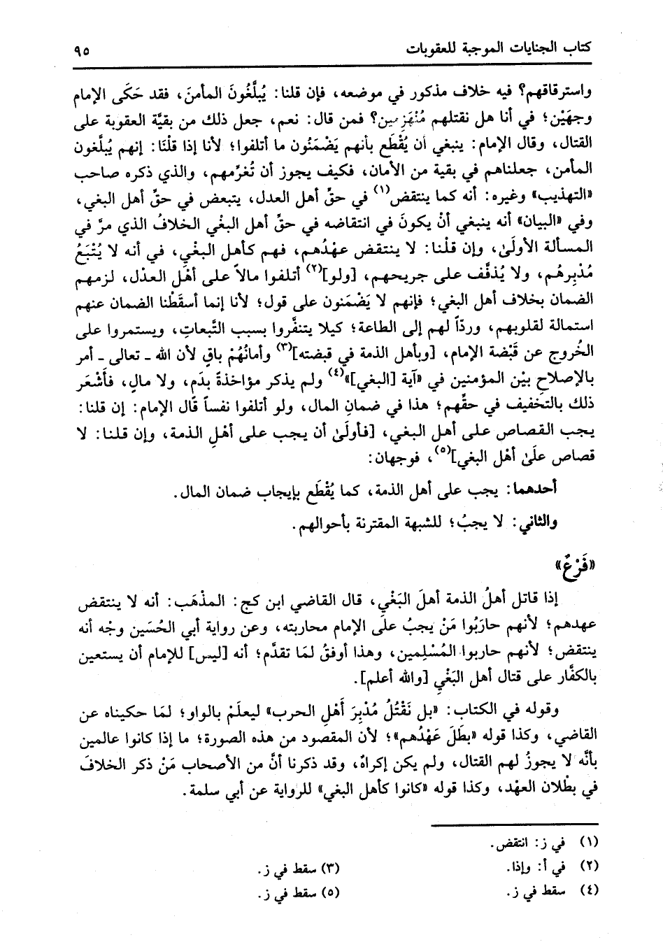 واسترقاقهم؟ فيه خلاف مذكور في موضعه، فإن قلنا: يُبلَّغُونَ المأمنَ، فقد حَكَى الإِمام وجهَيْن؛ في أنا هل نقتلهم مُنْهَزِمين؟ فمن قال: نعم، جعل ذلك من بقيَّة العقوبة على القتال، وقال الإِمام: ينبغي أن يُقْطَع بأنهم يَضْمَنُون ما أتلفوا؛ لأنا إذا قلْنَا: إنهم يُبلَّغون المأمن، جعلناهم في بقية من الأمان، فكيف يجوز أن تُغرِّمهم، والذي ذكره صاحب "التهذيب" وغيره: أنه كما ينتقض (¬1) في حقِّ أهل العدل، يتبعض في حقِّ أهل البغْي، وفي "البيان" أنه ينبغي أنْ يكونَ في انتقاضه في حقِّ أهل البغْي الخلافُ الذي مرَّ في المسألة الأولَى، وإن قلْنا: لا ينتقض عهْدُهم، فهم كأهل البغْي، في أنه لا يُتْبَعُ مُدْبِرهُم، ولا يُذفَّف على جريحهم، [ولو] (¬2) أتلفوا مالاً على أهْل العدْل، لزمهم الضمان بخلاف أهل البغْي؛ فإنهم لا يَضْمَنون على قول؛ لأنا إنما أسقَطْنا الضمان عنهم استمالة لقلوبهم، وردَّاً لهم إلى الطاعة؛ كيلا يتنفَّروا بسبب التَّبعاتِ، ويستمروا على الخُروج عن قَبْضة الإِمام، [وبأهل الذمة في قبضته] (¬3) وأمانُهُمْ باقٍ لأن الله -تعالى- أمر بالإصلاحِ بيْن المؤمنين في "آية [البغي] " (¬4) ولم يذكر مؤاخذةً بدَمٍ، ولا مالٍ، فأَشْعَر ذلك بالتخَفيف في حقِّهم؛ هذا في ضمانِ المال، ولو أتلفوا نفساً قال الإِمام: إن قلنا: يجب القصاص على أهل البغْي، [فأولَى أن يجب على أهْلِ الذمة، وإن قلنا: لا قصاص عَلَى أهْل البغي] (¬5)، فوجهان: