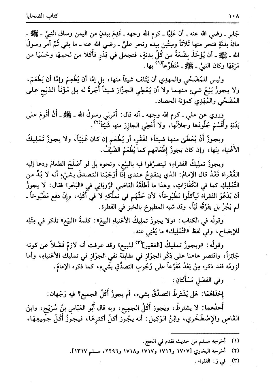 جَابرِ -رضي الله عنه- أن عَلِيًّا -كرم الله وجهه- قَدِمَ ببدنٍ من اليمن وساق النبيَّ -صلى الله عليه وسلم- مائةَ بدنَةٍ فنحر منها ثَلاَثاً وسِتِّين بيده ونحر عليٌّ -رضي الله عنه- ما بقي ثُمَّ أمر رسولُ الله -صلى الله عليه وسلم- أن يُؤْخَذَ بِضْعَةٌ من كُلِّ بدنةٍ، فتجعل في قِدْرٍ فأَكَلا من لحمِهَا وحَسَيَا من مَرَقِهَا وكان النبيُّ -صلى الله عليه وسلم- مُتَطَوِّعاً (¬1) بها.