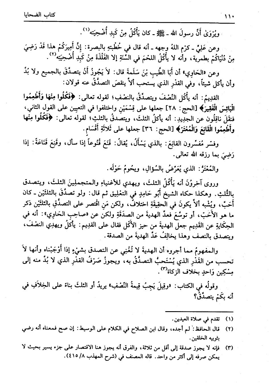 القدِيمُ: أنه يأْكُل النِّصْفَ ويتصدَّقُ بالنصْفِ؛ لقوله تعالى: {وَأَطْعِمُوا الْبَائِسَ الْفَقِيرَ} [الحج: 28] جعلها على قِسْمَيْنٍ واختلفوا في التعيِين على القول الثاني، فنقَلَ ناقِلُون عن الجدِيدِ: أنه يأكلُ الثلثَ، ويتصدقُ بالثلثِ؛ لقوله تعالى: {فَكُلُوا مِنْهَا وَأَطْعِمُوا الْقَانِعَ وَالْمُعْتَرَّ} [الحج: 36] جعلها على ثَلاثَةِ أَقْسَامٍ.