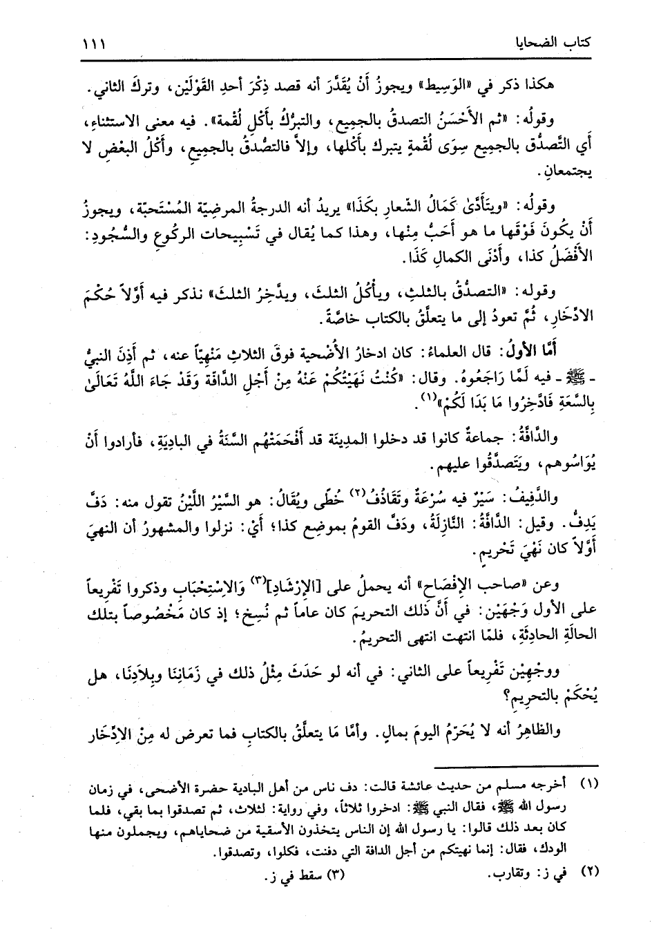 (¬1) أخرجه مسلم من حديث عائشة قالت: دف ناس من أهل البادية حضرة الأضحى، في زمان رسول الله -صلى الله عليه وسلم-، فقال النبي -صلى الله عليه وسلم-: ادخروا ثلاثاً، وفي رواية: لثلاث، ثم تصدقوا بما بقي، فلما كان بعد ذلك قالوا: يا رسول الله إن الناس يتخذون الأسقية من ضحاياهم، ويجملون منها الودك، فقال: إنما نهيتكم من أجل الدافة التي دفنت، فكلوا، وتصدقوا.