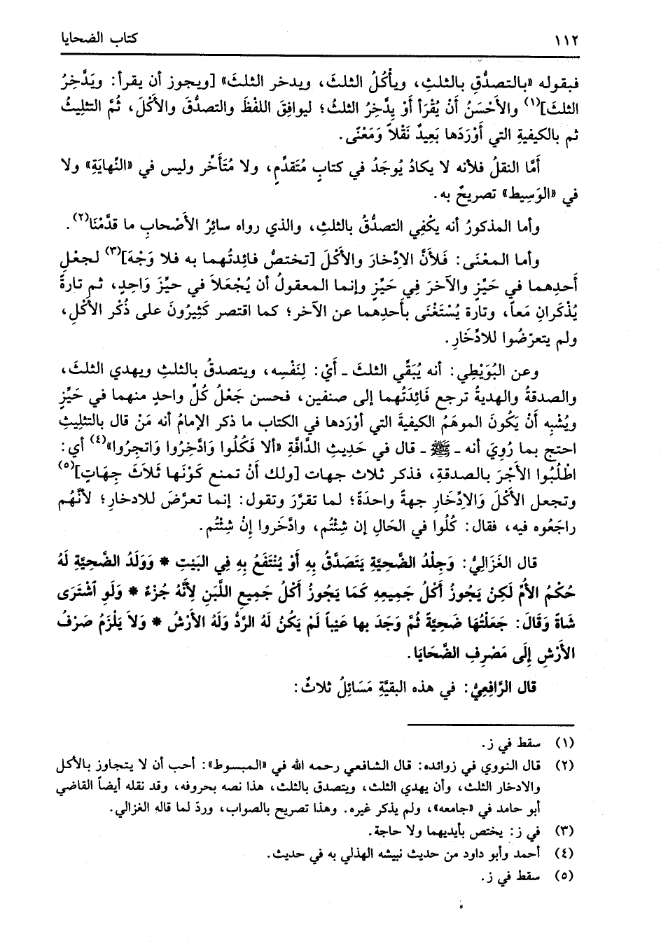 (¬2) قال النووي في زوائده: قال الشَّافعي رحمه الله في "المبسوط": أحب أن لا يتجاوز بالأكل والادخار الثلث، وأن يهدي الثلث، ويتصدق بالثلث، هذا نصه بحروفه، وقد نقله أيضاً القاضي أبو حامد في "جامعه"، ولم يذكر غيره. وهذا تصريح بالصواب، وردّ لما قاله الغزالي.