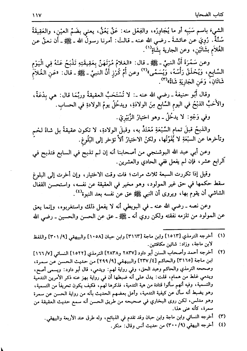 وعن سَمُرَةَ أَنَّ النبيَّ -صلى الله عليه وسلم- قال: "الغلامُ مُرْتَهَنٌ بِعَقِيقَتِهِ تَذْبَحُ عَنْهُ في الْيَوْم السَّابعِ، وَيُحْلَقُ رَأْسُهُ، وَيُسَمَّى" (¬2) وعن أُمِّ كُرْزٍ أَنَّ النبيَّ -صلى الله عليه وسلم- قال: "عَنِ الغُلاَمِ شَاتَانِ، وَعَنِ الجَارِيةِ شَاةٌ" (¬3).
