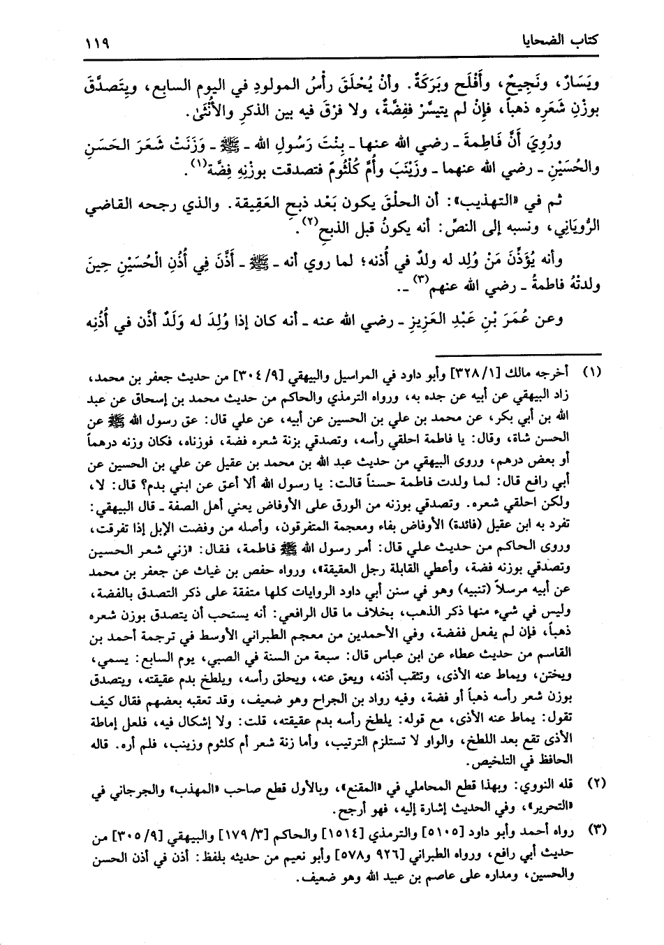 (¬1) أخرجه مالك [1/ 328] وأبو داود في المراسيل والبيهقي [9/ 304] من حديث جعفر بن محمد، زاد البيهقي عن أبيه عن جده به، ورواه الترمذي والحاكم من حديث محمد بن إسحاق عن عبد الله بن أبي بكر، عن محمد بن علي بن الحسين عن أبيه، عن علي قال: عق رسول الله -صلى الله عليه وسلم- عن الحسن شاة، وقال: يا فاطمة احلقي رأسه، وتصدقي بزنة شعره فضة، فوزناه، فكان وزنه درهماً أو بعض درهم، وروى البيهقي من حديث عبد الله بن محمد بن عقيل عن علي بن الحسين عن أبي رافع قال: لما ولدت فاطمة حسناً قالت: يا رسول الله ألا أعق عن ابني بدم؟ قال: لا، ولكن احلقي شعره. وتصدقي بوزنه من الورق على الأوفاض يعني أهل الصفة -قال البيهقي: تفرد به ابن عقيل (فائدة) الأوفاض بفاء ومعجمة المتفرقون، وأصله من وفضت الإبل إذا تفرقت، وروى الحاكم من حديث علي قال: أمر رسول الله -صلى الله عليه وسلم- فاطمة، فقال: "زني شعر الحسين وتصدقي بورنه فضة، وأعطي القابلة رجل العقيقة"، ورواه حفص بن غياث عن جعفر بن محمد عن أبيه مرسلاً (تنبيه) وهو في سنن أبي داود الروايات كلها متفقة على ذكر التصدق بالفضة، وليس في شيء منها ذكر الذهب، بخلاف ما قال الرافعي: أنه يستحب أن يتصدق بوزن شعره ذهباً، فإن لم يفعل ففضة، وفي الأحمدين من معجم الطبراني الأوسط في ترجمة أحمد بن القاسم من حديث عطاء عن ابن عباس قال: سبعة من السنة في الصبي، يوم السابع: يسمي، ويختن، ويماط عنه الأذى، وتثقب أذنه، ويعق عنه، ويحلق رأسه، ويلطخ بدم عقيقته، ويتصدق بوزن شعر رأسه ذهباً أو فضة، وفيه رواد بن الجراح وهو ضعيف، وقد تعقبه بعضهم فقال كيف تقول: يماط عنه الأذى، مع قوله: يلطخ رأسه بدم عقيقته، قلت: ولا إشكال فيه، فلعل إماطة الأذى تقع بعد اللطخ، والواو لا تستلزم الترتيب، وأما زنة شعر أم كلثوم وزينب، فلم أره. قاله الحافظ في التلخيص.