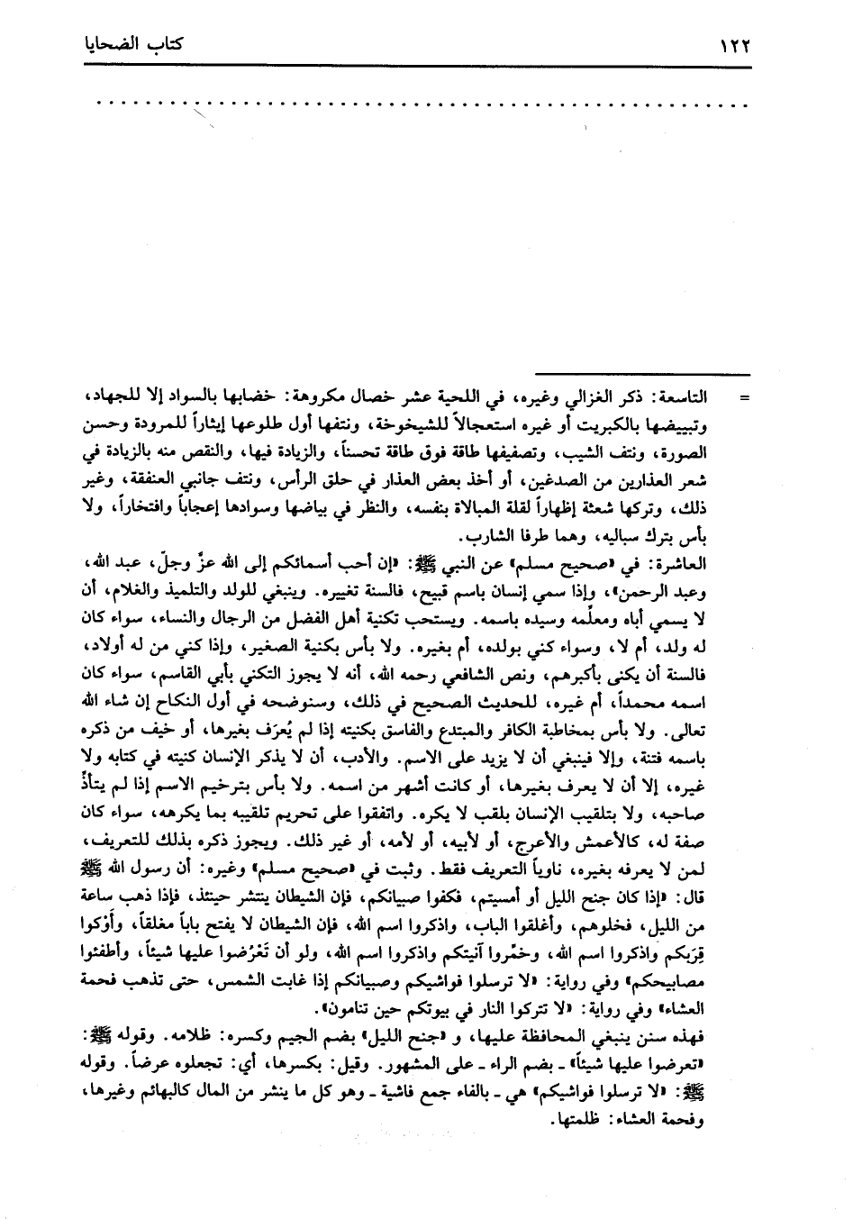 العاشرة: في "صحيح مسلم" عن النبي -صلى الله عليه وسلم-: "إن أحب أسمائكم إلى الله عزّ وجلّ، عبد الله، وعبد الرحمن"، وإذا سمي إنسان باسم قبيح، فالسنة تغييره. وينغي للولد والتلميذ والغلام، أن لا يسمي أباه ومعلِّمه وسيده باسمه. ويستحب تكنية أهل الفضل من الرجال والنساء، سواء كان له ولد، أم لا، وسواءكني بولده، أم بغيره. ولا بأس بكنية الصغير، وإذا كني من له أولاد، فالسنة أن يكنى بأكبرهم، ونص الشافعي رحمه الله، أنه لا يجوز التكني بأبي القاسم، سواء كان اسمه محمداً، أم غيره، للحديث الصحيح في ذلك، وسنوضحه في أول النكاح إن شاء الله تعالى. ولا بأس بمخاطبة الكافر والمبتدع والفاسق بكنيته إذا لم يُعرَف بغيرها، أو خيف من ذكره باسمه فتنة، وإلا فينبغي أن لا يزيد على الأسم. والأدب، أن لا يذكر الإنسان كنيته في كتابه ولا غيره، إلا أن لا يعرف بغيرها، أو كانت أشهر من اسمه. ولا بأس بترخيم الاسم إذا لم يتأذِّ صاحبه، ولا بتلقيب الإنسان بلقب لا يكره. واتفقوا على تحريم تلقيبه بما يكرهه، سواء كان صفة له، كالأعمش والأعرج، أو لأبيه، أو لأمه، أو غير ذلك. ويجوز ذكره بذلك للتعريف، لمن لا يعرفه بغيره، ناوياً التعريف فقط. وثبت في "صحيح مسلم" وغيره: أن رسول الله -صلى الله عليه وسلم- قال: "إذا كان جنح الليل أو أمسيتم، فكلفوا صبيانكم، فإن الشيطان ينتشر حينئذ، فهذا ذهب ساعة من الليل، فخلوهم، وأغلقوا الباب، واذكروا اسم الله، فإن الشيطان لا يفتح باباً مغلقاً، وأَوْكوا قِرَبكم واذكروا اسم الله، وخمِّروا آنيتكم واذكروا اسم الله، ولو أن تَعْرُضوا عليها شيئاً، وأطفئوا مصابيحكم" وفي رواية: "لا ترسلوا فواشيكم وصبيانكم إذا غابت الشمس، حتى تذهب فحمة العشاء" وفي رواية: "لا تتركوا النار في بيوتكم حين تنامون".