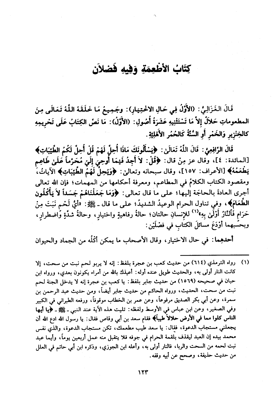 قَالَ الرَّافِعِيُّ: قَالَ الله تَعَالَى: {يَسْأَلُونَكَ مَاذَا أُحِلَّ لَهُمْ قُلْ أُحِلَّ لَكُمُ الطَّيِّبَاتُ} [المائدة: 4]، وقال عز مِنْ قال: {قُلْ لَا أَجِدُ فِي مَا أُوحِيَ إِلَيَّ مُحَرَّمًا عَلَى طَاعِمٍ يَطْعَمُهُ} [الأنعام: 145]، وقال سبحانه وتعالى: {وَيُحِلُّ لَهُمُ الطَّيِّبَاتِ} الآياتُ، ومقصود الكتاب الكلامُ في المطاعم، ومعرفة أحكامها من المهمات؛ فإن الله تعالى أجرى العادةَ بالحاجَة إليها؛ على ما قال تعالى: {وَمَا جَعَلْنَاهُمْ جَسَدًا لَا يَأْكُلُونَ الطَّعَامَ}، وفي تناول الحرام الوعيدُ الشديدُ؛ على ما قال -صلى الله عليه وسلم-: "أيُّ لَحْمٍ نَبَتَ مِنْ حَرَامٍ فَالنَّارُ أَوْلَى بِهِ" (¬1) للإنسانِ حالتان؛ حالةُ رفاهيةٍ واختيارٍ، وحالةُ شدَّةٍ وَاضطرارٍ، وبحسبهما أوْدَعَ مسائلَ الكتَابِ في فصْلَيْن: