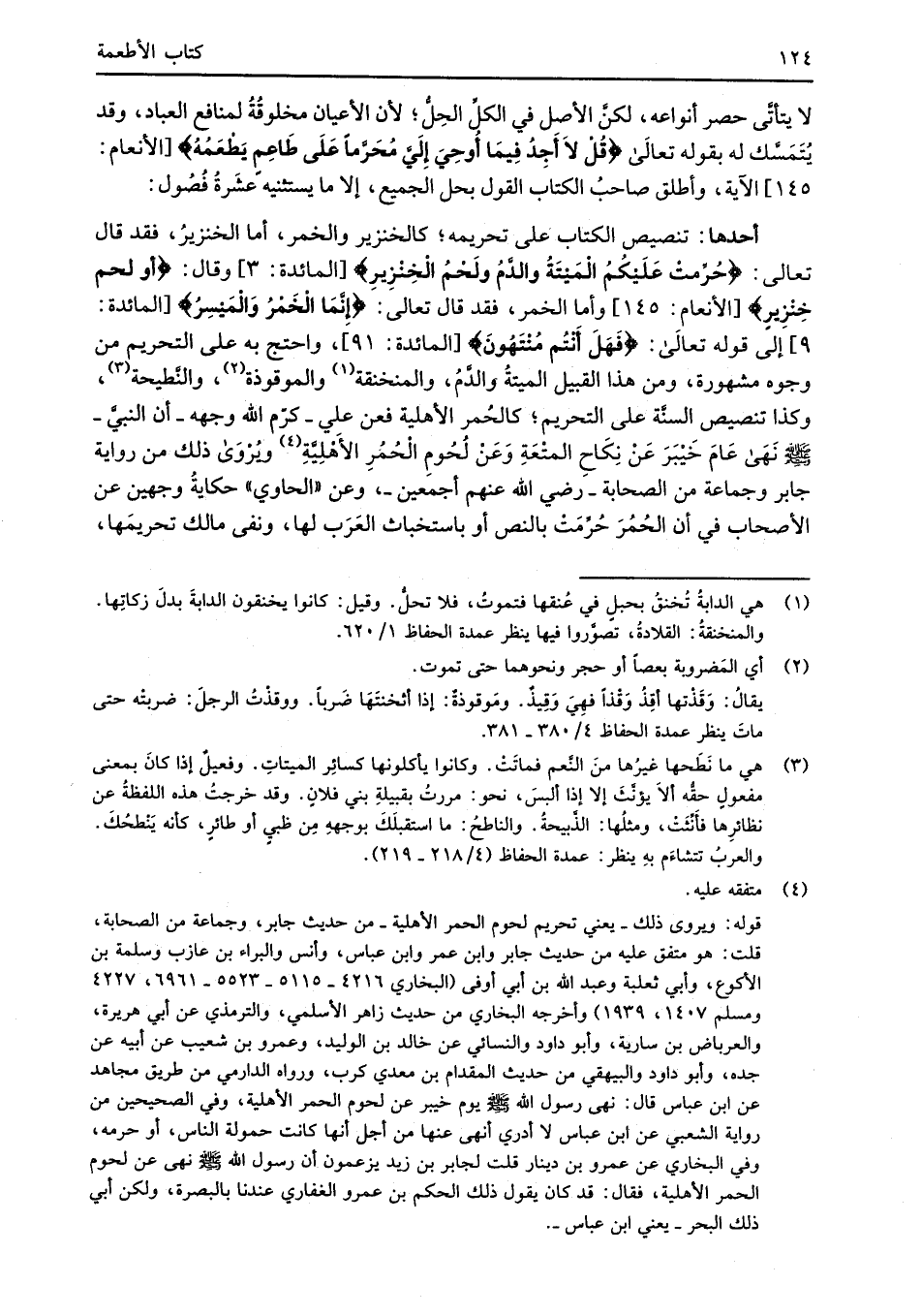 أحدها: تنصيص الكتاب على تحريمه؛ كالخنزير والخمر، أما الخنزيرُ، فقد قال تعالى: {حُرِّمَتْ عَلَيْكُمُ الْمَيْتَةُ وَالدَّمُ وَلَحْمُ الْخِنْزِيرِ} [المائدة: 3] وقال: {أَوْ لَحْمَ خِنْزِيرٍ} [الأنعام: 145] وأما الخمر، فقد قال تعالى: {إِنَّمَا الْخَمْرُ وَالْمَيْسِرُ} [المائدة: 90] إلى قوله تعالَى: {فَهَلْ أَنْتُمْ مُنْتَهُونَ} [المائدة: 91]، واحتج به على التحريم من وجوه مشهورة، ومن هذا القبيل الميتةُ والدَّمُ، والمنخنقة (¬1) والموقوذة (¬2)، والنَّطيحة (¬3)، وكذا تنصيص السنَّة على التحريم؛ كالحُمر الأهلية فعن علي -كرّم الله وجهه- أن النبيَّ -صلى الله عليه وسلم- نَهَى عَامَ خَيْبَرَ عَنْ نِكَاحِ المتْعَةِ وَعَنْ لُحُومِ الْحُمُرِ الأَهْلِيَّةِ (¬4) ويُرْوَى ذلك من رواية جابر وجماعة من الصحابة -رضي الله عنهم أجمعين-، وعن "الحاوي" حكايةُ وجهين عن الأصحاب في أن الحُمُرَ حُرِّمَتْ بالنص أو باستخباث العَرَب لها، ونفى مالك تحريمَها،