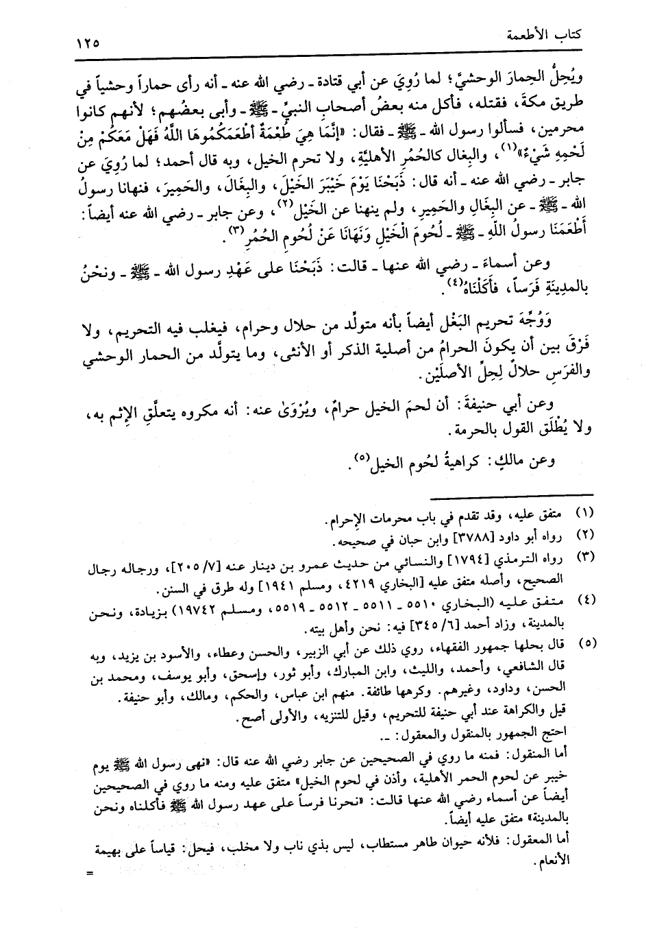 وعن أبي حنيفةَ: أن لحمَ الخيل حرامٌ، ويُرْوَى عنه: أنه مكروه يتعلَّقِ الإثم به، ولا يُطْلَق القول بالحرمة.