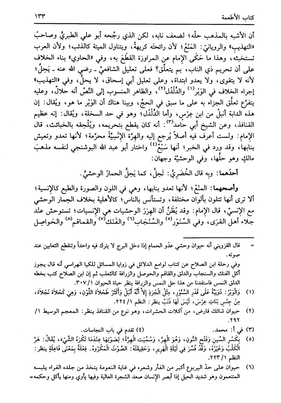 وفي رحلة ابن الصلاح عن كتاب لوامع الدلائل في زوايا المسائل للكيا الهراسي أنه قال يجوز أكل الفنك والسنجاب والدلق والقاقم والحوصل والزرافة كالثعلب ثم إن ابن الصلاح كتب بخطه الدلق النمس فاستفدنا من هذا حل النمس والزرافة ينظر حياة الحيوان 1/ 307.