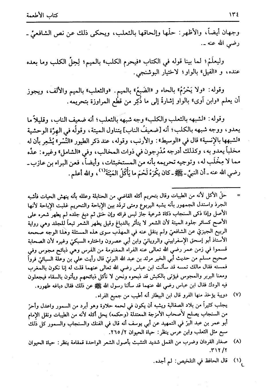 وقوله: "لشبهه بالثعلب والكلب" وجه شبهه بالثعلب؛ أنه ضعيف الناب، وقليلاً ما يعدو، ووجه شبهه بالكلب؛ أنه [ضعيفُ الناب] يتناول الميتة، وقولُه في الهِرَّة الوحشية "لشبهها بالإِنسية" قال في "الوسيط": والأرنب، وقوله، عند ذكر الطيور "النِّسْر" يُشْعِر بأن له مخلباً يعدو به، وكذلك أدرجه مُدْرِجون في ذوات المخالب، وفي "الشامل" وغيره: عدَّه مما لا مِخْلَب له، وتوجيه تحريمه بأنه من المستخبثات، وأيضاً، فعن البراء بن عازب -رضي الله عنه- أن النبيَّ -صلى الله عليه وسلم- كان يكْرَهُ لَحْمَ ما يَأْكُلُ المَيْتَةَ (¬1)، والله أعلم.