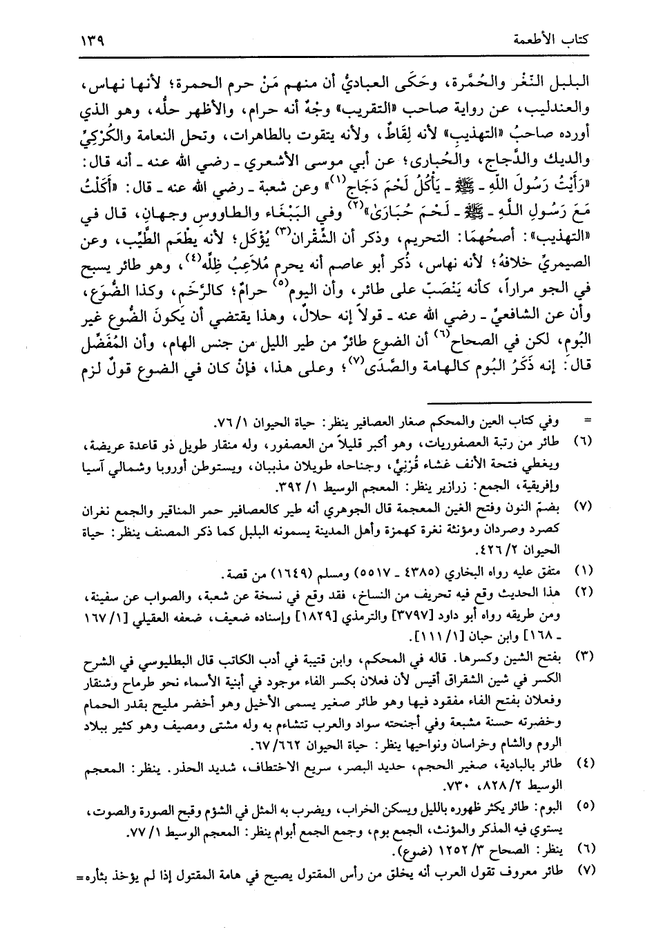 البلبل النّغْر والحُمَّرة، وحَكَى العباديُّ أن منهم مَنْ حرم الحمرة؛ لأنها نهاس، والعندليب، عن رواية صاحب "التقريب" وجْهٌ أنه حرام، والأظهر حلُّه، وهو الذي أورده صاحبُ "التهذيب" لأنه لِقَاطٌ، ولأنه يتقوت بالطاهرات، وتحل النعامة والكُرْكِيِّ والديك والدَّجاج، والخُبارى؛ عن أبي موسى الأشعري -رضي الله عنه- أنه قال: "رَأَيْتُ رَسُولَ اللهِ -صلى الله عليه وسلم- يَأْكُلُ لَحْمَ دَجَاج (¬1) " عن شعبة -رضي الله عنه- قال: "أَكَلْتُ مَعَ رَسُولِ اللهِ -صلى الله عليه وسلم- لَحْمَ حُبَارَى" (¬2) وفي البَبْغَاء والطاووسِ وجهانِ، قال في "التهذيب": أصحُهمَا: التحريم، وذكر أن الشِّقْران (¬3) يُؤْكَل؛ لأنه يطْعَم الطَّيِّب، وعن الصيمريِّ خلافهُ؛ لأنه نهاس، ذُكر أبو عاصم أنه يحرم مُلاَعِبُ ظِلِّه (¬4)، وهو طائر يسبح في الجو مراراً، كأنه يَنْصَبّ على طائر، وأن اليوم (¬5) حرامٌ؛ كالرَّخَم، وكذا الضُّوَع، وأن عن الشافعيِّ -رضي الله عنه- قولاً إنه حلالٌ، وهذا يقتضي أن يَكونَ الضُّوع غير البُومِ، لكن في الصحاح (¬6) أن الضوع طائرٌ من طير الليل من جنس الهام، وأن المُفَضِّل قال: إنه ذَكَرُ البُوم كالهامة والصَّدَى (¬7)؛ وعلى هذا، فإنْ كان في الضوع قولٌ لزم