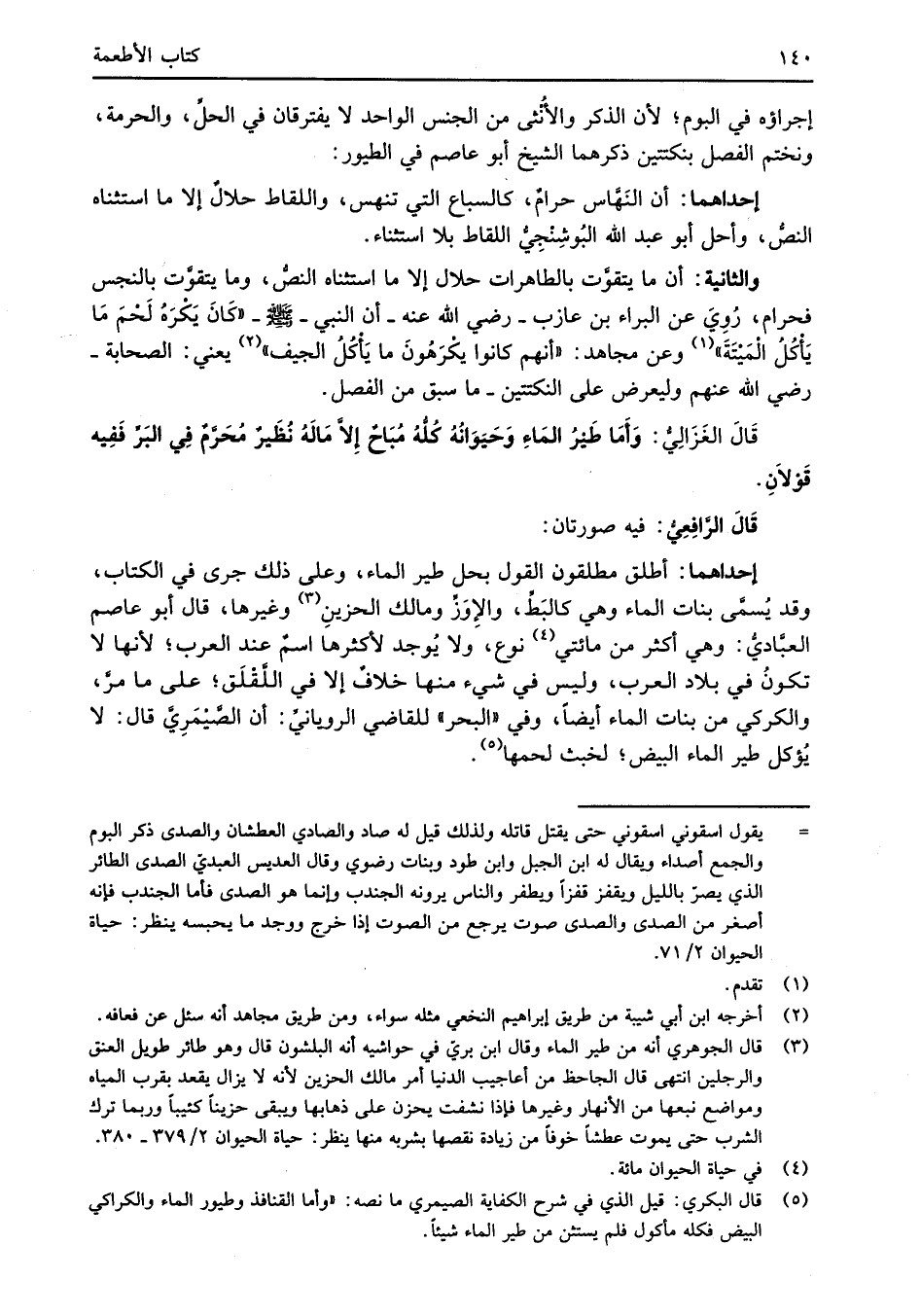 (¬5) قال البكري: قيل الذي في شرح الكفاية الصيمري ما نصه: "وأما القنافذ وطيور الماء والكراكي البيض فكله مأكول فلم يستثن من طير الماء شيئاً.