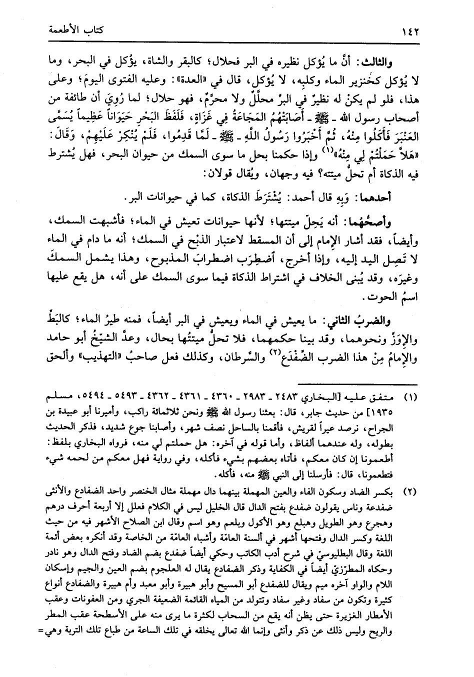 (¬2) بكسر الضاد وسكون الفاء والعين المهملة بينهما قال مهملة مثال الخنصر واحد الضفاح والأنثى ضفدعة وناس يقولون ضفدع بفتح الدال قال الخليل ليس في الكلام فعلل إلا أربعة أحرف درهم وهجرع وهو الطويل وهبلع وهو الأكول وبلعم وهو اسم وقال ابن الصلاح الأشهر فيه من حيث اللغة وكسر الدال وفتحها أشهر في ألسنة العامّة وأشباه العامّة من الخاصة وقد أنكره بعض أئمة اللغة وقال البطليوسيّ في شرح أدب الكاتب وحكي أيضاً ضفدع بضم الضاد وفتح الدال وهو نادر وحكاه المطرّزيّ أيضاً في الكفاية وذكر الضفاح يقال له العلجوم بضم العين والجيم وإسكان اللام والراو آخره ميم ويقال للضفدع أبو المسيح وأبو هبيرة وأبو معبد وأم هبيرة والضفاع أنواع كثيرة وتكون من سفاد وغير سفاد وتتولد من المياه القائمة الضعيفة الجري ومن العفونات وعقب الأمطار الغزيرة حتى يظن أنه يقع من السحاب لكثرة ما يرى منه على الأسطحة عقب المطر والريح وليس ذلك عن ذكر وأنثى وإنما الله تعالى يخلقه في تلك الساعة من طباع تلك التوبة وهي =