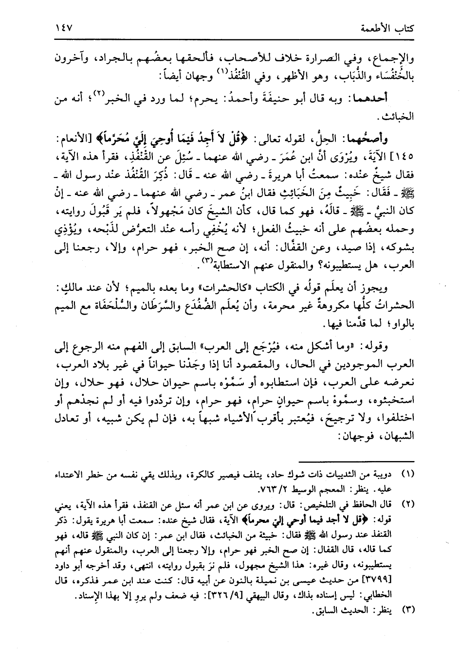 (¬2) قال الحافظ في التلخيص: قال: ويروى عن ابن عمر أنه سئل عن القنفذ، فقرأ هذه الآية، يعني قوله: {قُلْ لَا أَجِدُ فِي مَا أُوحِيَ إِلَيَّ مُحَرَّمًا} الآية، فقال شيخ عنده: سمعت أبا هريرة يقول: ذكر القنفذ عند رسول الله -صلى الله عليه وسلم- فقال: خبيثة من الخبائث، فقال ابن عمر: إن كان النبي -صلى الله عليه وسلم- قاله، فهو كما قاله، قال القفال: إن صح الخبر فهو حرام، وإلا رجعنا إلى العرب، والمنقول عنهم أنهم يستطيبونه، وقال غيره: هذا الشيخ مجهول، فلم نرَ بقبول روايته، انتهى، وقد أخرجه أبو داود [3799] من حديث عيسى بن نميلة بالنون عن أبيه قال: كنت عند ابن عمر فذكره، قال الخطابي: ليس إسناده بذاك، وقال البيهقي [9/ 326]: فيه ضعف ولم يروِ إلا بهذا الإِسناد.