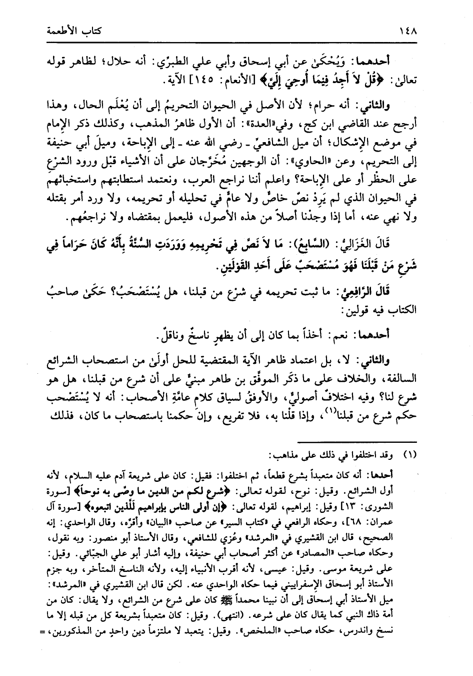 قَالَ الرَّافِعِيُّ: ما ثبت تحريمه في شرْع من قبلنا، هل يُسْتَصْحَبُ؟ حَكَى صاحبُ الكتاب فيه قولين: