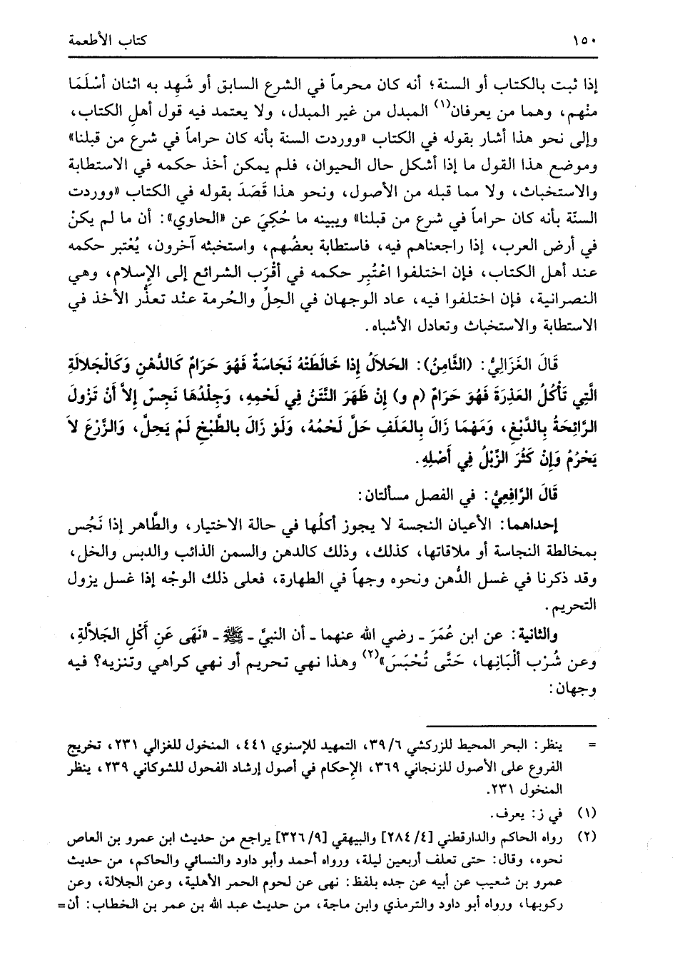 قَالَ الغَزَالِيُّ: (الثَّامِنُ): الحَلاَلُ إِذا خَالَطَتْهُ نَجَاسَةٌ فَهُوَ حَرَامٌ كَالدُّهْنِ وَكَالْجَلالَةِ الَّتِي تَأْكُلُ العَذِرَةَ فَهُوَ حَرَامٌ (م و) إِنْ ظَهَرَ النَّتَنُ فِي لَحْمِهِ، وَجِلْدُهَا نَجِسٌ إلاَّ أَنْ تَزْولَ الرَّائِحَةُ بِالدَّبْغِ، وَمَهْمَا زَالَ بِالعَلَفِ حَلَّ لَحْمُهُ، وَلَوْ زَالَ بالطَّبْخِ لَمْ يَحِلَّ، وَالزَّرْعَ لاَ يَحْرُمُ وَإِنْ كَثُرَ الزِّبْلُ فِي أَصْلِهِ.