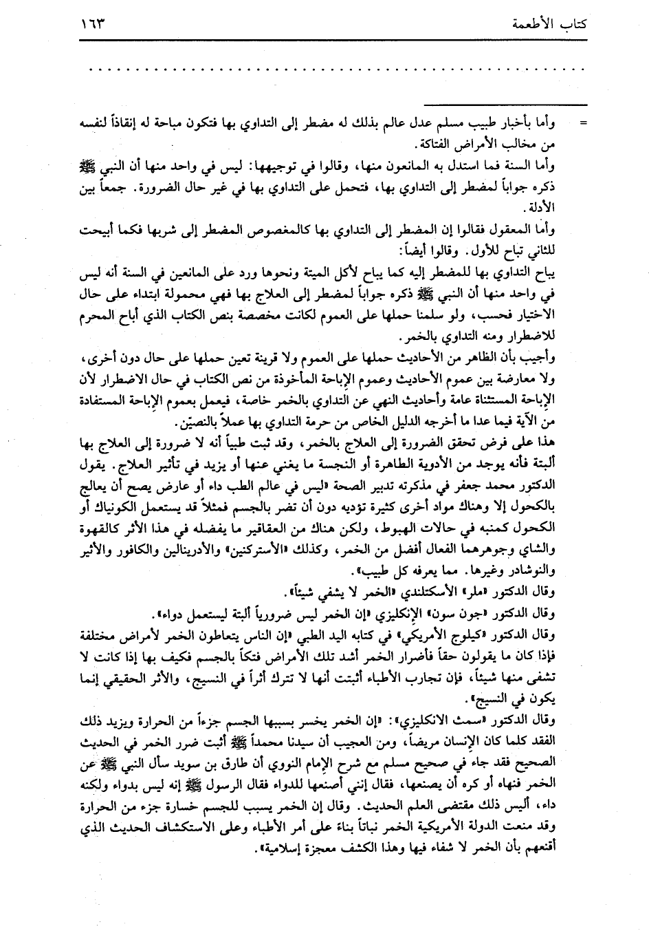 وقال الدكتور "سمث الانكليزي": "إن الخمر يخسر بسببها الجسم جزءاً من الحرارة ويزيد ذلك الفقد كلما كان الإِنسان مريضاً، ومن العجيب أن سيدنا محمداً -صلى الله عليه وسلم- أثبت ضرر الخمر في الحديث الصحيح فقد جاء في صحيح مسلم مع شرح الإِمام النووي أن طارق بن سويد سأل النبي -صلى الله عليه وسلم- عن الخمر فنهاه أو كره أن يصنعها، فقال إنني أصنعها للدواء فقال الوسول -صلى الله عليه وسلم- إنه ليس بدواء ولكنه داء، أليس ذلك مقتضى العلم الحديث. وقال إن الخمر يسبب للجسم خسارة جزء من الحرارة وقد منعت الدولة الأمريكية الخمر نباتاً بناءً على أمر الأطباء وعلى الاستكشاف الحديث الذي أقنعهم بأن الخمر لا شفاء فيها وهذا الكشف معجزة إسلامية".