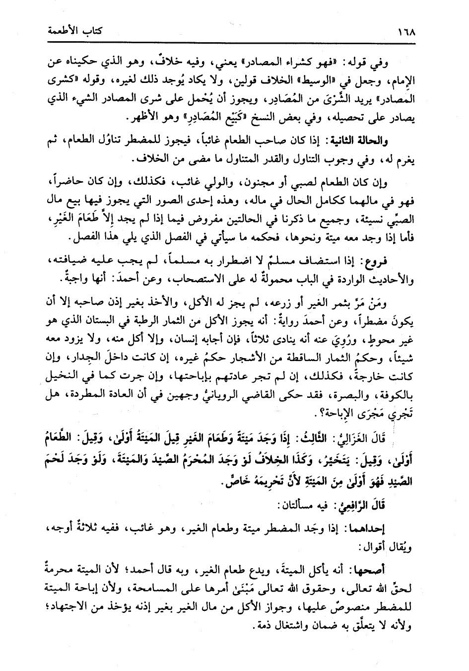 قَالَ الغَزَالِيُّ: الثَّالِثُ: إِذَا وَجَدَ مَيْتَةً وَطَعَامَ الغَيْرِ قِيلَ المَيْتَة أَوْلَى، وَقِيلَ: الطَّعَامُ أَوْلَى، وَقِيلَ: يَتَخَيَّرُ، وَكَذَا الخِلاَفُ لَوْ وَجَدَ المُحْرَمُ الصَّيْدَ وَالمَيْتَةَ، وَلَوْ وَجَدَ لَحْمَ الصَّيْدِ فَهُوَ أوْلَى مِنَ المَيْتَةِ لأَنَّ تَحْرِيمَهُ خَاصٌّ.