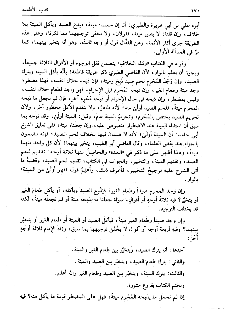 وإن وجد المحرم صيداً وطعام الغير، فيَذْبح الصيد ويأكله، أو يأكل طعام الغير أو يتخيَّر؟ فيه ثلاثةً أوجهٍ أو أقوالٍ، سواءٌ جعلنا ما يذبحه ميتة أو لم نجعلْه ميتةً، لكنه قد يختلف التوجيه.