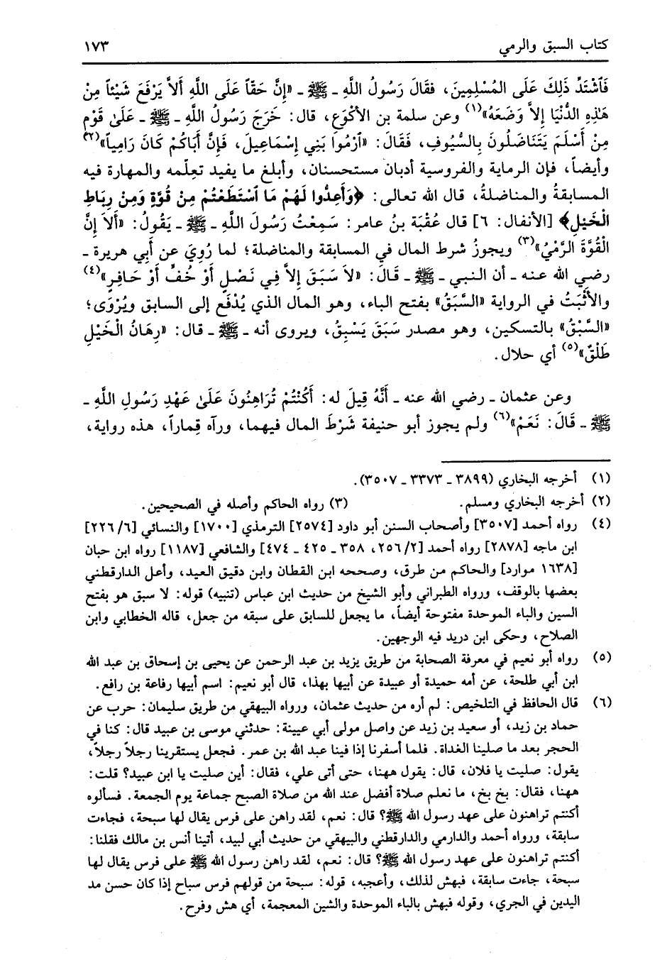 (¬6) قال الحافظ في التلخيص: لم أره من حديث عثمان، ورواه البيهقي من طريق سليمان: حرب عن حماد بن زيد، أو سعيد بن زيد عن واصل مولى أبي عيينة: حدثني موسى بن عبيد قال: كنا في الحجر بعدما صلينا الغداة. فلما أسفرنا إذا فينا عبد الله بن عمر. فجعل يستقرينا رجلاً رجلاً، يقول: صليت يا فلان، قال: يقول هاهنا، حتى أتى علي، فقال: أين صليت يا ابن عبيد؟ قلت: هاهنا، فقال: بخ بخ، ما نعلم صلاة أفضل عند الله من صلاة الصبح جماعة يوم الجمعة. فسألوه أكنتم تراهنون على عهد رسول الله -صلى الله عليه وسلم-؟ قال: نعم، لقد راهن على فرس يقال لها سبحة، فجاءت سابقة، ورواه أحمد والدارمي والدارقطني والبيهقي من حديث أبي لبيد، أتينا أنس بن مالك فقلنا: أكنتم تراهنون على عهد رسول الله -صلى الله عليه وسلم-؟ قال: نعم، لقد راهن رسول الله -صلى الله عليه وسلم- على فرس يقال لها سبحة، جاءت سابقة، فبهش لذلك، وأعجبه، قوله: سبحة من قولهم فرس سباح إذا كان حسن مد اليدين في الجري، وقوله فبهش بالباء الموحدة والشين المعجمة، أي هش وفرح.