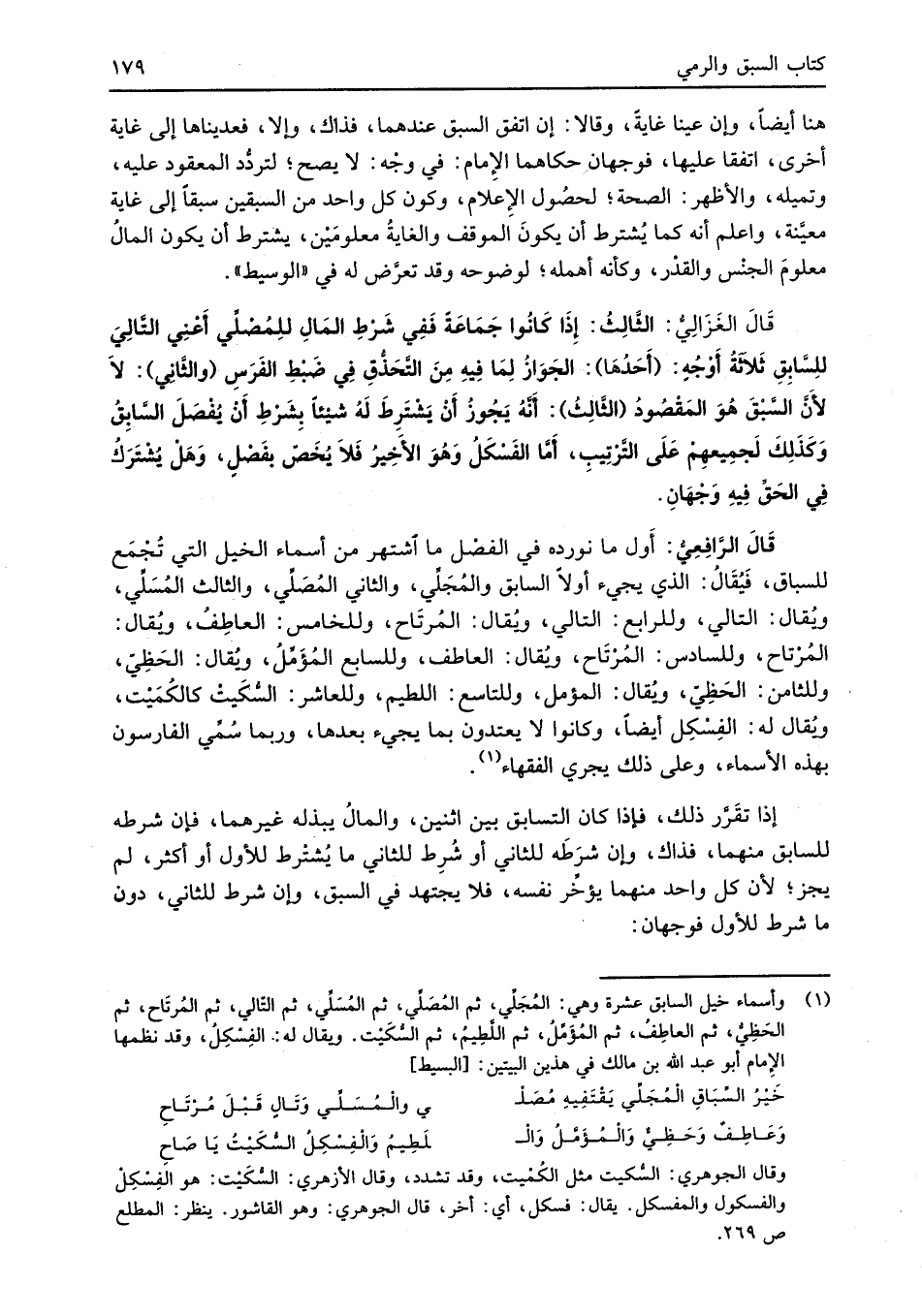 قَالَ الرَّافِعِيُّ: أَول ما نورده في الفصْل ما اشتهر من أسماء الخيل التي تُجْمَع للسباق، فَيُقَالُ: الذي يجيء أولاً السابق والمُجَلِّي، والثاني المُصَلِّي، والثالث المُسَلِّي، ويُقال: التالي، وللرابع: التالي، ويُقال: المُرتَاح، وللخامس: العاطِفُ، ويُقال: المُرْتاح، وللسادس: المُرْتَاح، ويُقال: العاطف، وللسابع المُؤَمِّلُ، ويُقال: الحَظِيّ، وللثامن: الحَظِيّ، ويُقال: المؤمل، وللتاسع: اللطيم، وللعاشر: السُّكَيتْ كالكُمَيْت، ويُقال له: الفِسْكِل أيضاً، وكانوا لا يعتدون بما يجيء بعدها، وربما سُمِّي الفارسون بهذه الأسماء، وعلى ذلك يجري الفقهاء (¬1).