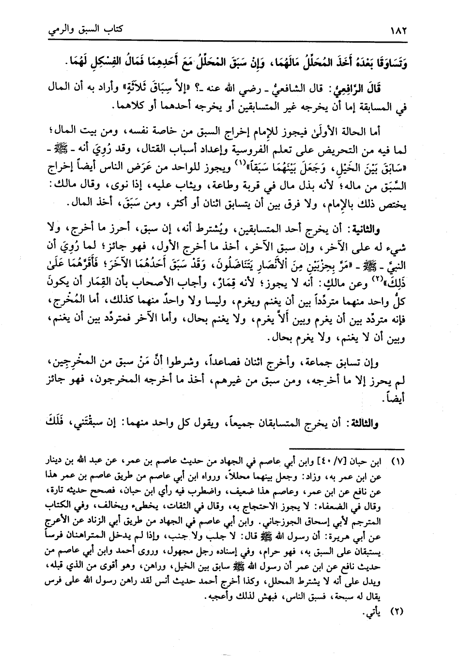 قَالَ الرَّافِعِيُّ: قال الشافعيُّ -رضي الله عنه-؟ "إلاَّ سِبَاقَ ثَلاثَةٍ" وأراد به أن المال في المسابقة إما أن يخرجه غير المتسابقين أو يخرجه أحدهما أو كلاهما.
