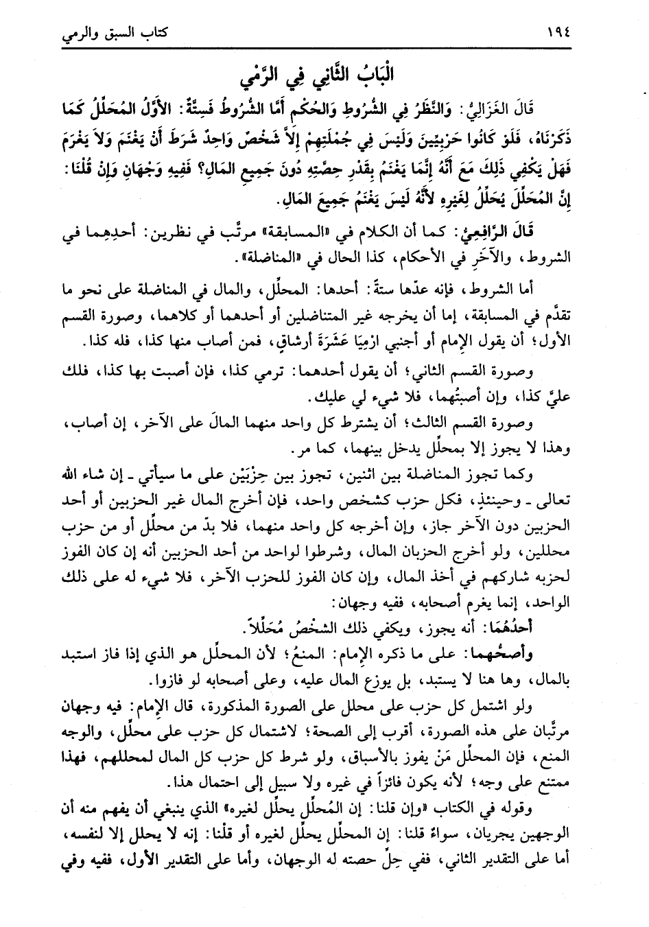 ولو اشتمل كل حزب على محلل على الصورة المذكورة، قال الإِمام: فيه وجهان مرتَّبان على هذه الصورة، أقرب إلى الصحة؛ لاشتمال كل حزب على محلِّل، والوجه المنع، فإن المحلِّل مَنْ يفوز بالأسباق، ولو شرط كل حزب كل المال لمحللهم، فهذا ممتنع على وجه؛ لأنه يكون فائزاً في غيره ولا سبيل إلى احتمال هذا.