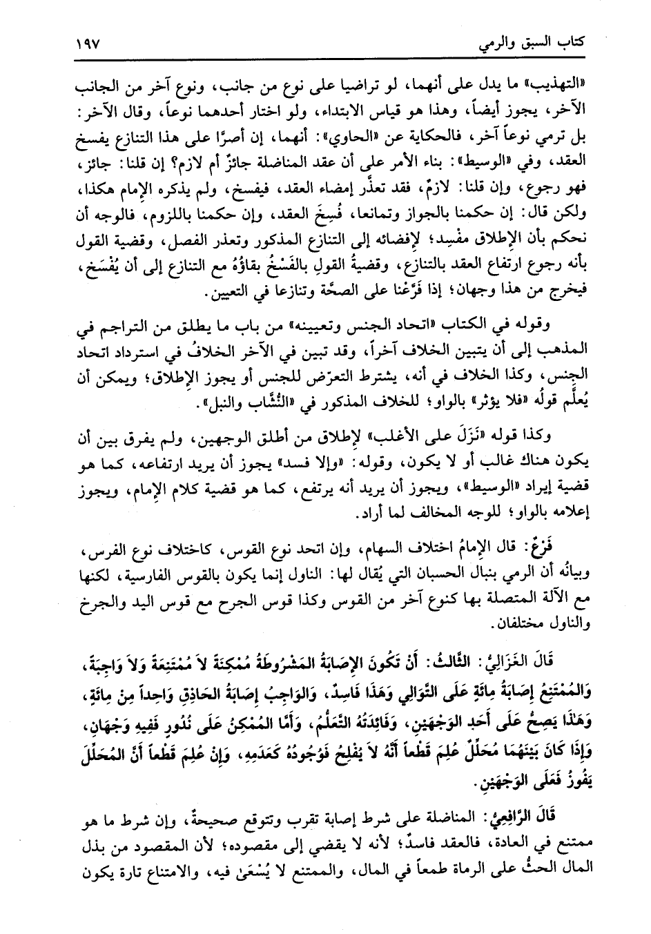 "التهذيب" ما يدل على أنهما، لو تراضيا على نوع من جانب، ونوع آخر من الجانب الآخر، يجوز أيضاً، وهذا هو قياس الابتداء، ولو اختار أحدهما نوعاً، وقال الآخر: بل ترمي نوعاً آخر، فالحكاية عن "الحاوي": أنهما، إن أصرَّا على هذا التنازع يفسخ العقد، وفي "الوسيط": بناء الأمر على أن عقد المناضلة جائزٌ أم لازم؟ إن قلنا: جائز، فهو رجوع، وإن قلنا: لازمٌ، فقد تعذَّر إمضاء العقد، فيفسخ، ولم يذكره الإِمام هكذا، ولكن قال: إن حكمنا بالجواز وتمانعا، فُسِخَ العقد، وإن حكمنا باللزوم، فالوجه أن نحكم بان الإِطلاق مفْسِد؛ لإِفضائه إلى التنازع المذكور وتعذر الفصل، وقضية القول بأنه رجوع ارتفاع العقد بالتنازع، وقضيةُ القولِ بالفَسْخُ بقاؤُهُ مع التنازع إلى أن يُفْسَخ، فيخرج من هذا وجهان؛ إذا فَرَّعْنا على الصحَّة وتنازعا في التعيين.