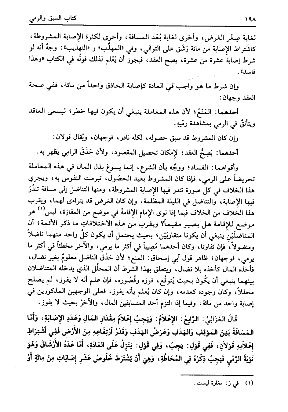 وأقواهما: الفساد؛ ووجّه بأن الشرع، إنما يسوغ بذل المال في هذه المعاملة تحريضاً على الرمي، فهذا كان المشروط بعيد الحصُول، تبرمت النفوس به، ويجري هذا الخلاف في كل صورة تندر فيها الإِصابة المشروطة، ومنها التناضل إلى مسافة تندُرُ فيها الإِصابة، والتناضل في الليلة المظلمة، وإن كان الغرض قد يتراءى لهما، ويقرب هذا الخلاف من الخلاف فيما إذا نوى الإِمام الإِقامةَ في موضع من المفازة، ليس (¬1) هو موضع للإِقامة هل يصير مقيماً؟ ويقرب من هذه الاختلافاتِ ما ذكر الأئمة؛ أن المناضلَيْنِ ينبغي أن يكونا متقاربَيْن؛ بحيث يحتمل أن يكون كلُّ واحد منهما ناضلاً ومنضولاُ، فإن تفاوتا، وكان أحدهما مُصِيباً في أكثر ما يرمي، والآخر مخطئاً في أكثر ما يرمي، فوجهان؛ ظاهر قول أبي إسحاق: المنع؛ لأن حَذَق الناضل معلومٌ بغير نضال، فأخذه المال كأخذه بلا نضال، ويتعلق بهذا الشرط أن المحلِّل الذي يدخله المتناضلان بينهما ينبغي أن يكُونَ بحيث يُتوقَّع، فوزه وقُصُوره، فإن علم أنه لا يفوز، لم يصلح محللاً، وكان وجوده كعدمه، وإن كان يُعلم بأنه يفوز، فعلى الوجهين المذكورين في إصابة واحد من مائة، وفيما إذا التزم أحد المتسابقين المال، والآخرُ بحيث لا يفوز.
