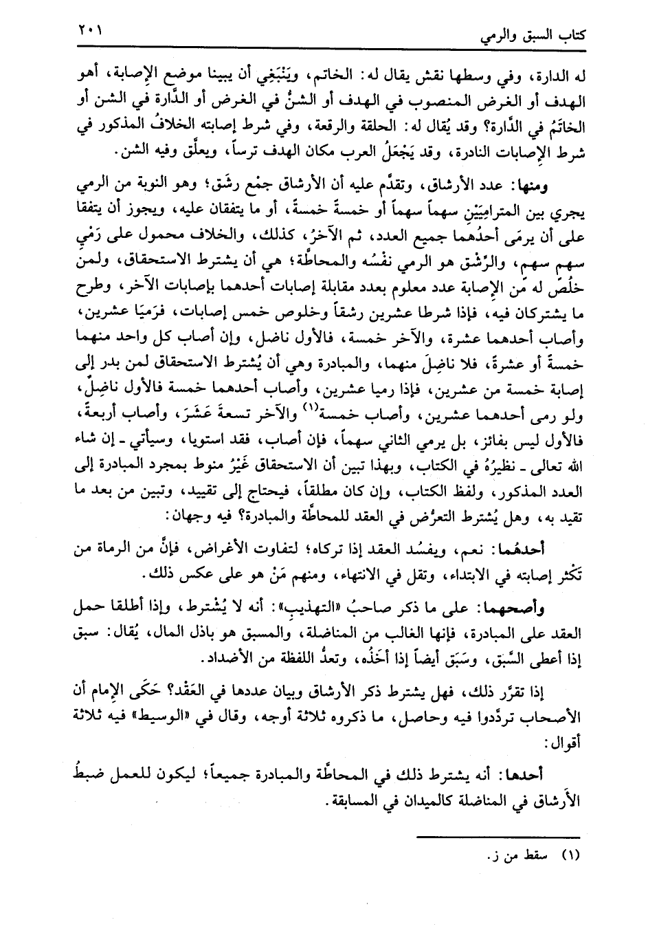 ومنها: عدد الأرشاق، وتقدَّم عليه أن الأرشاق جمْع رشَق؛ وهو النوبة من الرمي يجري بين المترامِيَيْنِ سهماً سهماً أو خمسةً خمسةً، أو ما يتفقان عليه، ويجوز أن يتفقا على أن يرمَى أحدُهما جميع العدد، ثم الآخرُ، كذلك، والخلاف محمول على رَمْيِ سهمٍ سهمٍ، والرَّشْق هو الرمي نفْسُه والمحاطَّة؛ هي أن يشترط الاستحقاق، ولمن خلُص له مَن الإِصابة عدد معلوم بعدد مقابلة إصابات أحدهما بإصابات الآخر، وطرح ما يشتركان فيه، فإذا شرطا عشرين رشقاً وخلوص خمس إصابات، فرَميَا عشرين، وأصاب أحدهما عشرة، والآخر خمسة، فالأول ناضل، وإن أصاب كل واحد منهما خمسةً أو عشرةً، فلا ناضِلَ منهما، والمبادرة وهي أن يُشترط الاستحقاق لمن بدر إلى إصابة خمسة من عشرين، فهذا رميا عشرين، وأصاب أحدهما خمسة فالأول ناضِلٌ، ولو رمى أحدهما عشرين، وأصاب خمسة (¬1) والآخر تسعةَ عَشَرَ، وأصاب أربعةً، فالأول ليس بفائز، بل يرمي الثاني سهماً، فإن أصاب، فقد استويا، وسيأتي -إن شاء الله تعالى- نظيرُهُ في الكتاب، وبهذا تبين أن الاستحقاق غَيْرُ منوط بمجرد المبادرة إلى العدد المذكور، ولفظ الكتاب، وإن كان مطلقاً، فيحتاج إلى تقييد، وتبين من بعد ما تقيد به، وهل يُشترط التعرُّض في العقد للمحاطَّة والمبادرة؟ فيه وجهان: