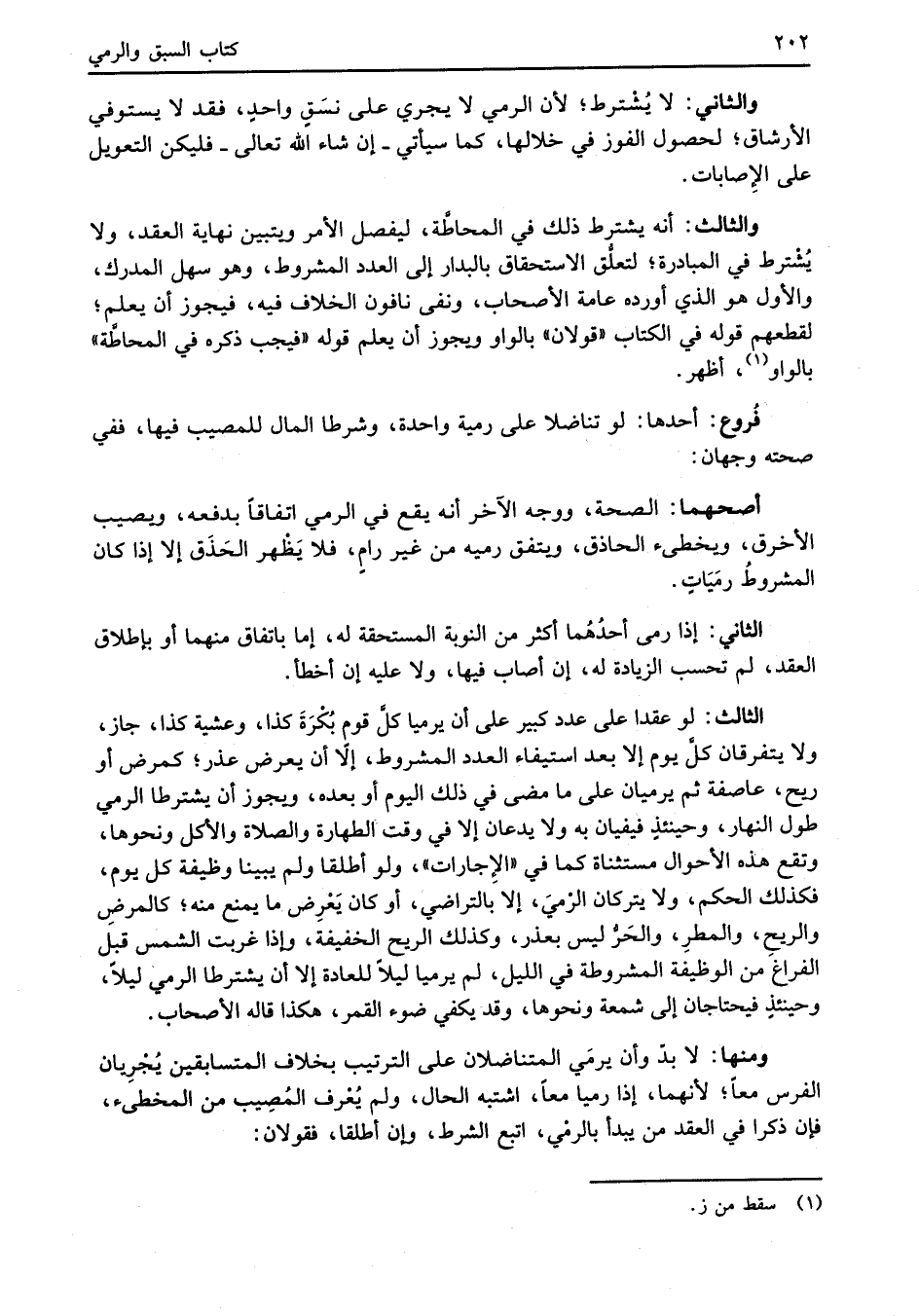ومنها: لا بدّ وأن يرمَي المتناضلان على الترتيب بخلاف المتسابقين يُجْرِيان الفرس معاً؛ لأنهما، إذا رميا معاً، اشتبه الحال، ولم يُعْرف المُصِيب من المخطئ، فإن ذكرا في العقد من يبدأ بالرمْي، اتبع الشرط، وإن أطلقا، فقولان: