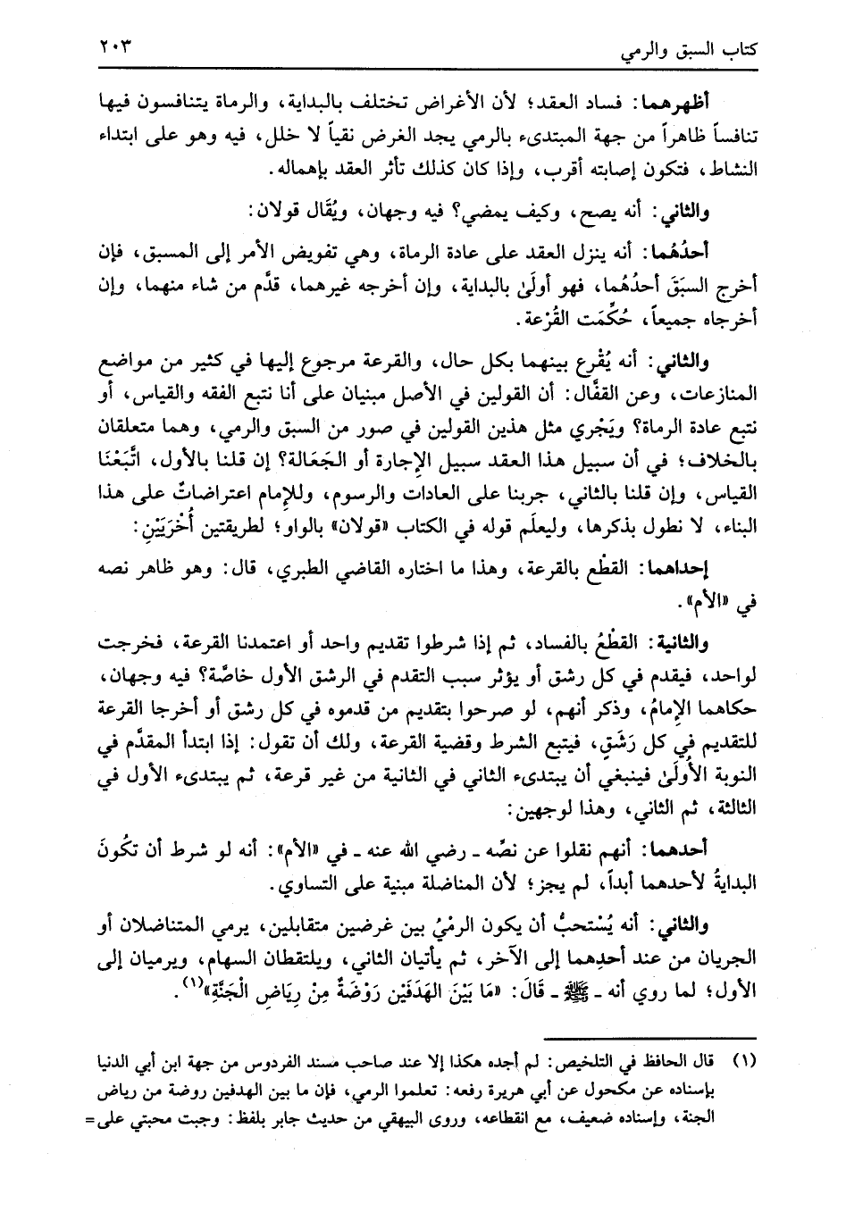 والثاني: أنه يُسْتحبُّ أن يكون الرمْيُ بين غرضين متقابلين، يرمي المتناضلان أو الجريان من عند أحدِهما إلى الآخر، ثم يأتيان الثاني، ويلتقطان السهام، ويرميان إلى الأول؛ لما روي أنه -صلى الله عليه وسلم- قَالَ: "مَا بَيْنَ الهَدَفَيْن رَوْضَةٌ من رِيَاضِ الْجَنَّةِ" (¬1).