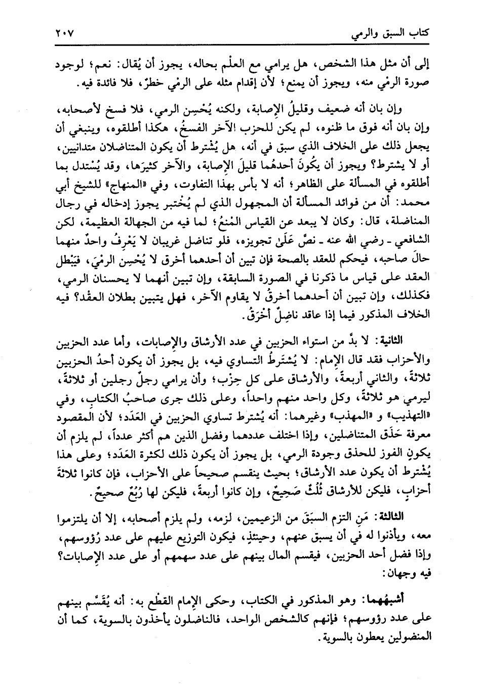 الثانية: لا بدَّ من استواء الحزبين في عدد الأرشاق والإِصابات، وأما عدد الحزبين والأحزاب فقد قال الإِمام: لا يُشتَرطُ التساوي فيه، بل يجوز أن يكون أحدُ الحزبين ثلاثةً، والثاني أربعةً، والأرشاق على كل حِزْب؛ وأن يرامي رجلٌ رجلين أو ثلاثة، ليرمي هو ثلاثةً، وكل واحد منهم واحداً، وعلى ذلك جرى صاحبُ الكتابِ، وفي "التهذيب" و"المهذب" وغيرهما: أنه يُشترط تساوي الحزبين في العَدَد؛ لأن المقصود معرفة حَذَق المتناضلين، وإذا اختلف عددهما وفضل الذين هم أكثر عدداً، لم يلزم أن يكون الفوز للحذق وجودة الرمي، بل يجوز أن يكون ذلك لكثرة العَدَد؛ وعلى هذا يُشْترط أن يكون عدد الأرشاق؛ بحيث ينقسم صحيحاً على الأحزاب، فإن كانوا ثلاثةَ أحزابٍ، فليكن للأرشاق ثُلُثٌ صَحِيحٌ، وإن كانوا أربعةً، فليكن لها رُبُعٌ صحيحٌ.