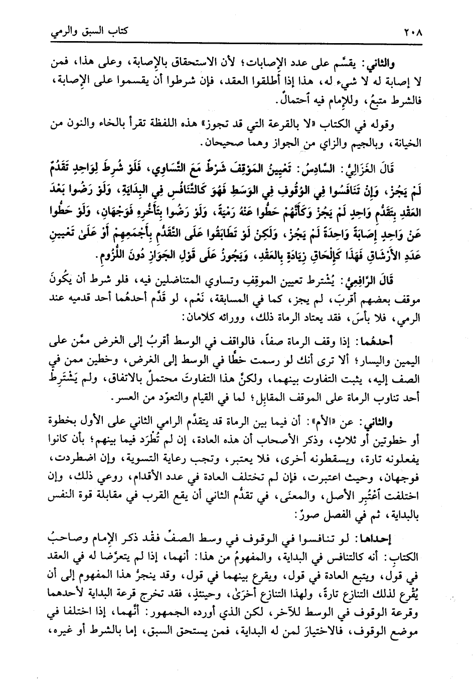 قَالَ الغَزَالِيُّ: السَّادِسُ تَعْيِينُ المَوْقِفَ شَرْطٌ مَعَ التَّسَاوِي، فَلَوْ شُرِطَ لِوَاحِدٍ تَقَدُمٌ لَمْ يَجُزْ، وَإِنْ تَنَافَسُوا فِي الوُقُوفِ فِي الوَسَطِ فَهُوَ كَالتَّنَافُسِ فِي البِدَايَةِ، وَلَوْ رَضُوا بَعْدَ العَقْدِ بَقَدُّمِ وَاحِدٍ لَمْ يَجُزْ وَكَأَنَّهُمْ حَطُّوا عَنْهُ رَمْيَةً، وَلَوْ رَضُوا بِتَأخُّرِهِ فَوَجْهَانِ، وَلَوْ حَطُّوا عَنْ وَاحِدٍ إِصَابَةً وَاحِدَةً لَمْ يَجُزْ، وَلَكِنْ لَوْ تَطَابَقُوا عَلَى التَّقَدُّمِ بِأَجْمَعِهِمْ أَوْ عَلَى تَعْيينِ عَدَدِ الأَرْشَاقِ فَهَذَا كَإِلْحَاقِ زَيادَةٍ بِالعَقْدِ، وَيَجُوزُ علَى قَوْلِ الجَوَازِ دُونَ اللُّزُومِ.