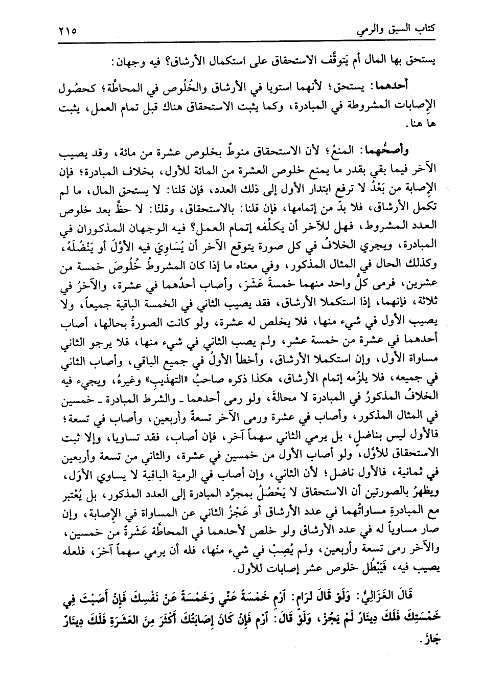 قَالَ الغَزَالِيُّ: وَلَوْ قَالَ لرَامٍ: ارْمِ خَمْسَةً عَنِّي وَخَمْسَةً عَنْ نَفْسِكَ فَإِنْ أَصَبْتَ فِي خَمْسَتِكَ فَلَكَ دِينَارٌ لَمْ يَجُزْ، وَلَوْ قَالَ: أرْم فَإنْ كَانَ إِصَابَتُكَ أَكْثَرَ مِنَ العَشَرَةِ فَلَكَ دِينَارٌ جَازَ.
