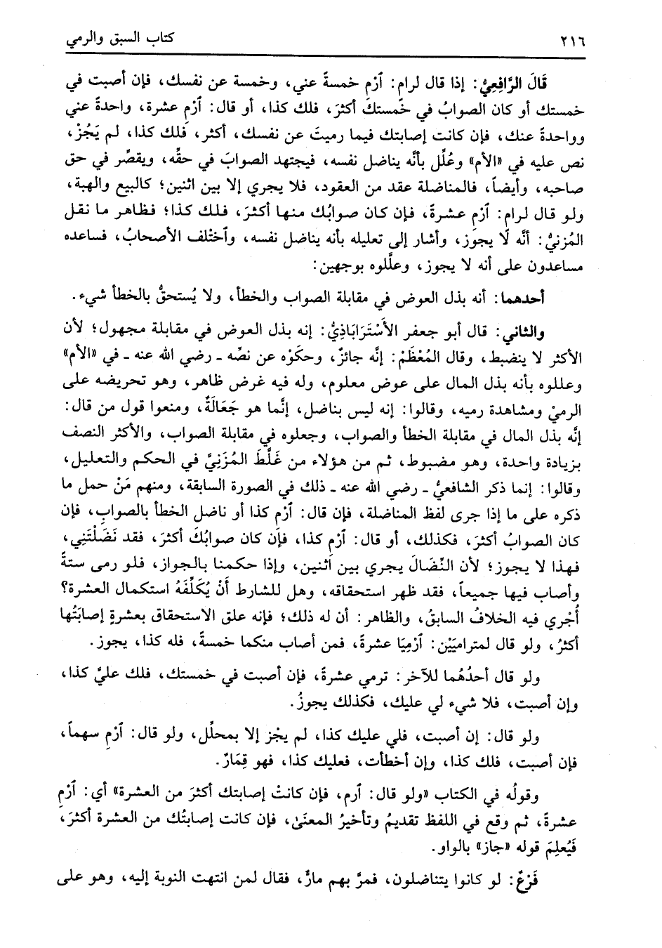 قَالَ الرَّافِعِيُّ: إذا قال لرامٍ: ارْمٍ خمسةً عني، وخمسةً عن نفسك، فإن أصبت في خمستك أو كان الصوابُ في خمستكَ أكثرَ، فلك كذا، أو قال: ارْمِ عشرة، واحدةً عني وواحدةً عنك، فإن كانت إصابتك فيما رميتَ عن نفسك، أكثر، فلك كذا، لم يَجُزْ، نص عليه في "الأم" وعُلِّل بأنَّه يناضل نفسه، فيجتهد الصوابَ في حقِّه، ويقصِّر في حق صاحبه، وأيضاً، فالمناضلة عقد من العقود، فلا يجري إلا بين اثنين؛ كالبيع والهبة، ولو قال لرام: ارْمِ عشرةً، فإن كان صوابُك منها أكثرَ، ذلك كذا؛ فظاهر ما نقل المُزنيُّ: أنَّه لا يجوز، وأشار إلى تعليله بأنه يناضل نفسه، واختْلف الأصحابُ، فساعده مساعدون على أنه لا يجوز، وعلَّلوه بوجهين: