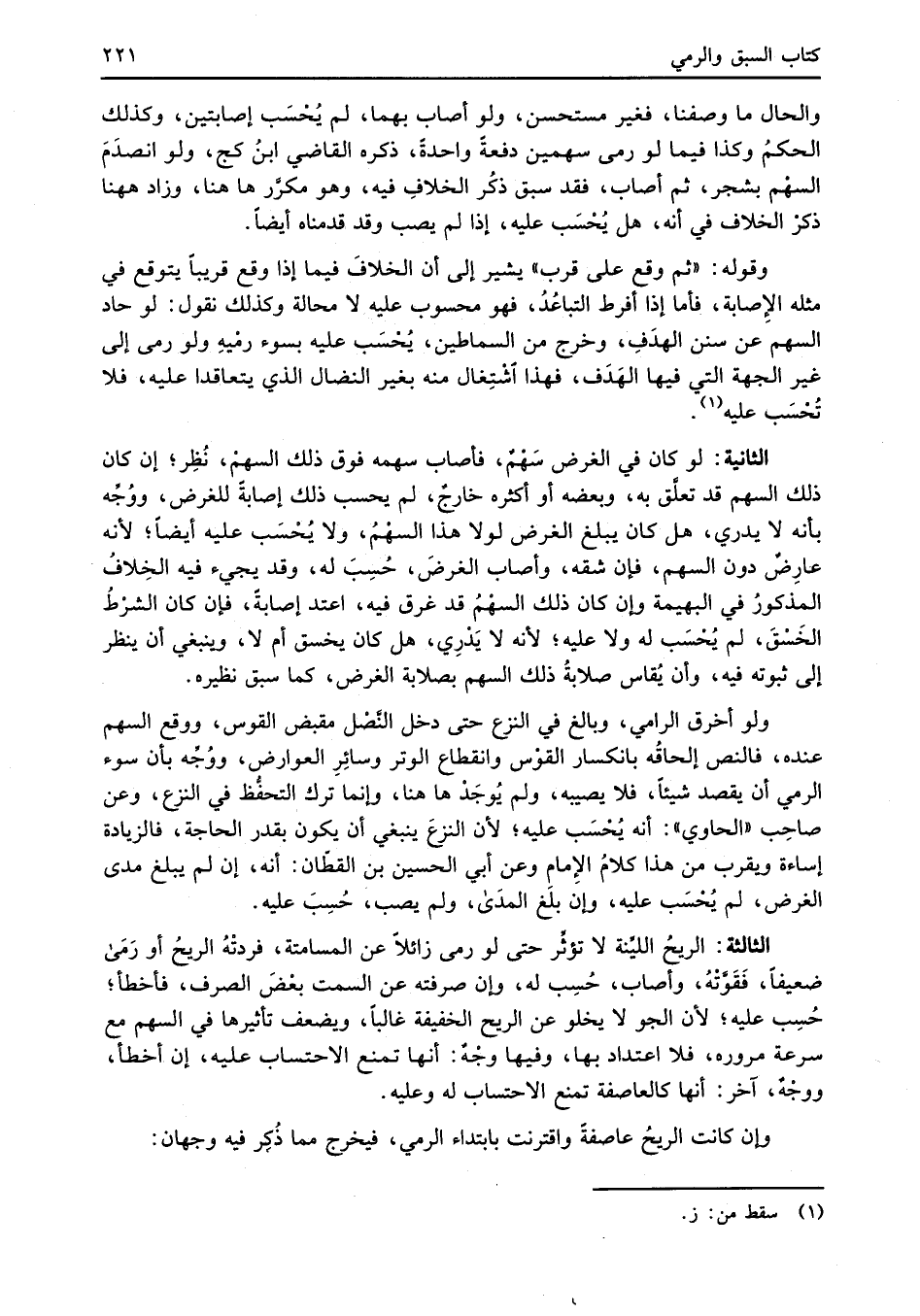 الثالثة: الريحُ الليِّنة لا تؤثر حتى لو رمى زائلاً عن المسامتة، فردتْهُ الريحُ أو رَمَى ضعيفاً، فَقَوَّتْهُ، وأصاب، حُسِب له، وإن صرفته عن السمت بعْضَ الصرف، فأخطأ؛ حُسِب عليه؛ لأن الجو لا يخلو عن الريح الخفيفة غالباً، ويضعف تأثيرها في السهم مع سرعة مروره، فلا اعتداد بها، وفيها وجْهٌ: أنها تمنع الاحتساب عليه، إن أخطأ، ووجْهٌ، آخر: أنها كالعاصفة تمنع الاحتساب له وعليه.