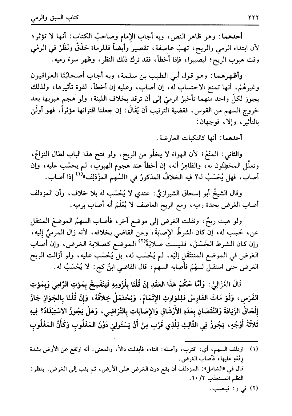 والثاني: المنْعُ؛ لأن الهواءَ لا يخلُو من الريح، ولو فتح هذا الباب لطال النزاعُ، وتعلَّل المخطِئُون به، والظاهِرُ أنه، إن أخطأ عند هجوم الهبوب، لم يحسب عليه، وإن أصاب، فهل يُحْسَبُ له؟ فيه الخلاف المذكورُ في "السُهم المزْدَلِف" (¬1) إذا أصاب.