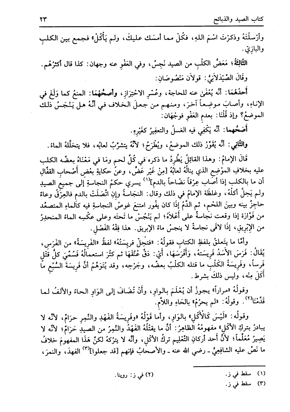 قَالَ الإمامُ: وهذا القائِلُ يَطَّرِدُ ما ذكره في كُلِّ لحمٍ ومَا في مَعْنَاهُ بعضَّه الكلب عليه بخلافِ الموْضِعِ الذي ينالُهُ لعابُهُ [مِنْ غَيْر عَضٍّ، وعن حكايةِ بعْضِ أَصْحاب القفَّالِ أن ما بالكلب إذا أصاب عِرْقاً نضّاحاً بالدم] (¬1) يسري حكمُ النجاسةِ إلى جميعَ الصيدِ ولم يَحِلَّ أكلُهُ، وغلظَة الإمامُ في ذلك وقال: النجَاسةُ وإنِ اتَّصَلَتْ بالدمِ فالعِرْقُ وعاءٌ حاجِزٌ بينه وبينَ اللحْم، ثم الدَّمُ إذَا كان يفُور امتنعَ غوصُ النجاسةِ فيه كالماءِ المتصعِّد من فَوَّارَة إذا وقعت نجَاسةٌ على أَعْلاَهُ؛ لم يَنْجُسْ ما تَحتَه وعلى عكْسِه الماءُ المنحدِرُ من الإِبْريقِ، إذَا لاقَى نجاسةً لا ينجسُ ماءُ الإبريق. هذا فِقْهُ الفَصْلِ.