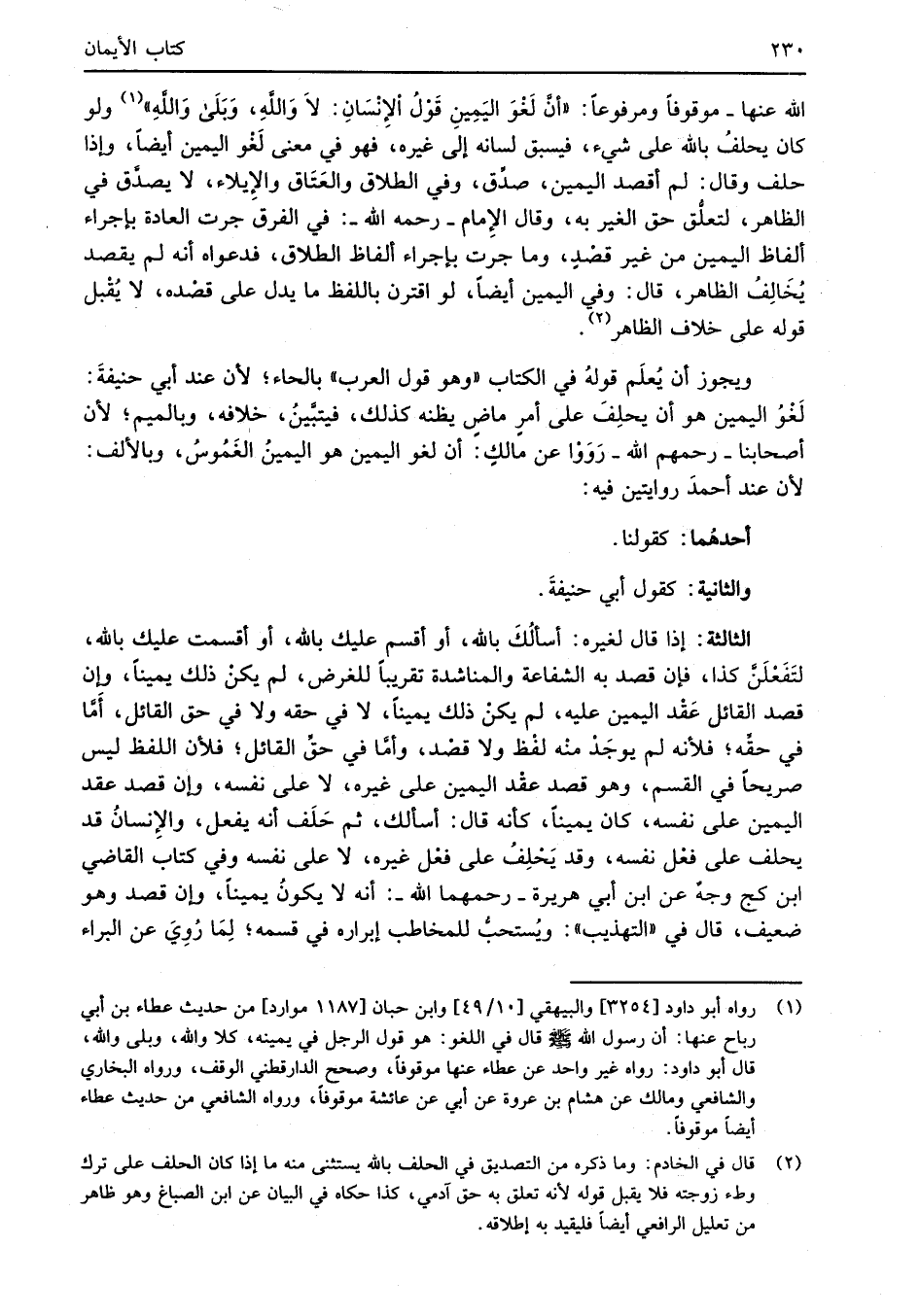 ويجوز أن يُعلَم قولهُ في الكتاب "وهو قول العرب" بالحاء؛ لأن عند أبي حنيفةَ: لَغْوُ اليمين هو أن يحلِفَ على أمرٍ ماضٍ يظنه كذلك، فيتبَّينُ، خلافه، وبالميم؛ لأن أصحابنا -رحمهم الله- رَوَوْا عن مالكِ: أن لغو اليمين هو اليمينُ الغَمُوسُ، وبالألف: لأن عند أحمدَ روايتين فيه: