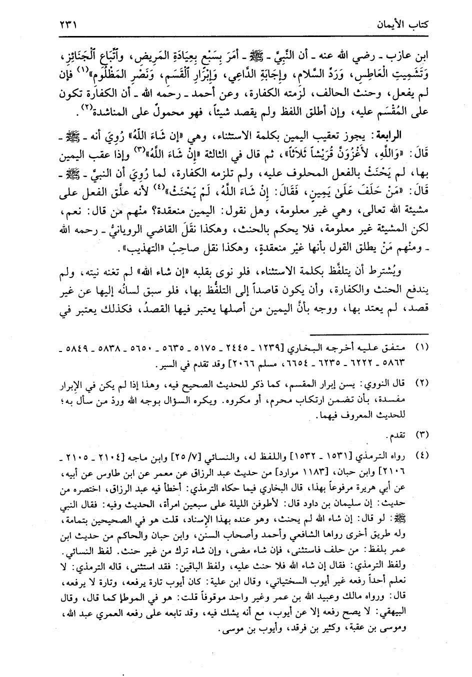 (¬4) رواه الترمذي [1531 - 1532] واللفظ له، والنسائي [7/ 25] وابن ماجه [2104 - 2105 - 2106] وابن حبان، [1183 موارد] من حديث عبد الرزاق عن معمر عن ابن طاوس عن أبيه، عن أبي هريرة مرفوعاً بهذا، قال البخاري فيما حكاه الترمذي: أخطأ فيه عبد الرزاق، اختصره من حديث: إن سليمان بن داود قال: لأطوفن الليلة على سبعين امرأة، الحديث وفيه: فقال النبي -صلى الله عليه وسلم-: لو قال: إن شاء الله لم يحنث، وهو عنده بهذا الإِسناد، قلت هو في الصحيحين بتمامة، وله طريق أخرى رواها الشَّافعي وأحمد وأصحاب السنن، وابن حبان والحاكم من حديث ابن عمر بلفظ: من حلف فاستثنى، فإن شاء مضى، وإن شاء ترك من غير حنث. لفظ النسائي. ولفظ الترمذي: فقال إن شاء الله فلا حنث عليه، ولفظ الباقين: فقد استثنى، قاله الترمذي: لا نعلم أحداً رفعه غير أيوب السختياني، وقال ابن علية: كان أيوب تارة يرفعه، وتارة لا يرفعه، قال: ورواه مالك وعبيد الله بن عمر وغير واحد موقوفًا قلت: هو في الموطإ كما قال، وقال البيهقي: لا يصح رفعه إلا عن أيوب، مع أنه يشك فيه، وقد تابعه على رفعه العمري عبد الله، وموسى بن عقبة، وكثير بن فرقد، وأيوب بن موسى.
