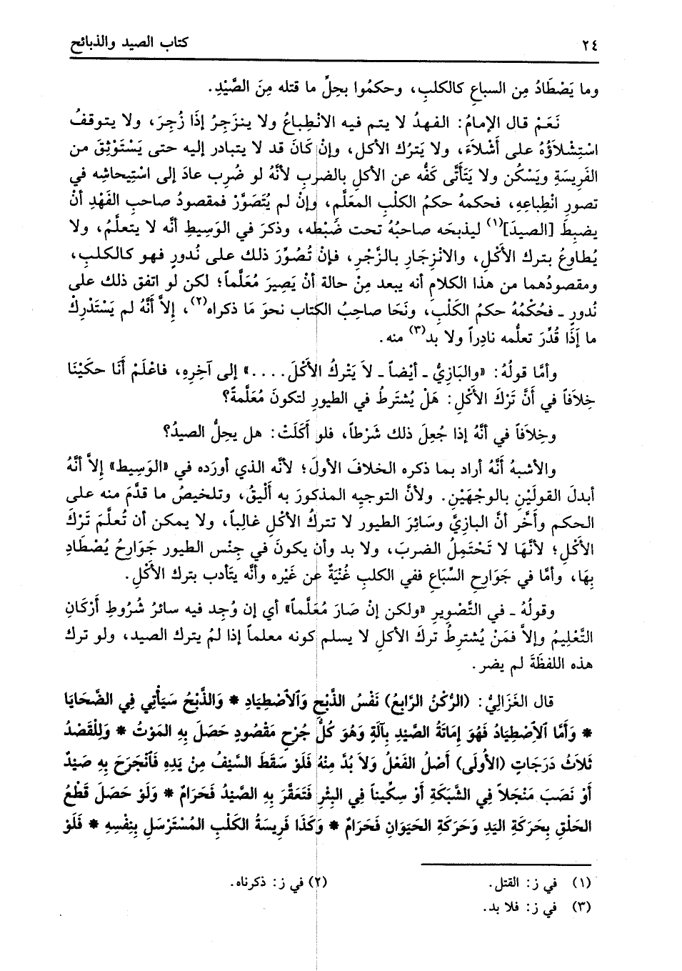 والأشبهُ أَنَّهُ أراد بما ذكره الخلافَ الأولَ؛ لأنَّه الذي أورَده في "الوَسِيط" إِلاَّ أنَّهُ أبدلَ القولَيْنِ بالوجْهَيْنِ. ولأنَّ التوجيه المذكورَ به أَلْيقُ، وتلخيصُ ما قدَّمَ منه على الحكم وأَخَّر أنَّ البازِيَّ وسَائِرَ الطيورَ لا تتركُ الأكْلِ غالِباً، ولا يمكن أن تُعلَّمَ تَرْكَ الأَكْلِ؛ لأنَّهَا لا تَحْتَمِلُ الضربَ، ولا بد وأن يكونَ في جِنْس الطيور جَوَارحُ يُصْطَادِ بِهَا، وأمَّا في جَوَارحِ السِّبَاعِ ففي الكلبِ غُنْيَةٌ عن غَيْره وأنَّه يتَأدب بترك الأكْلِ.