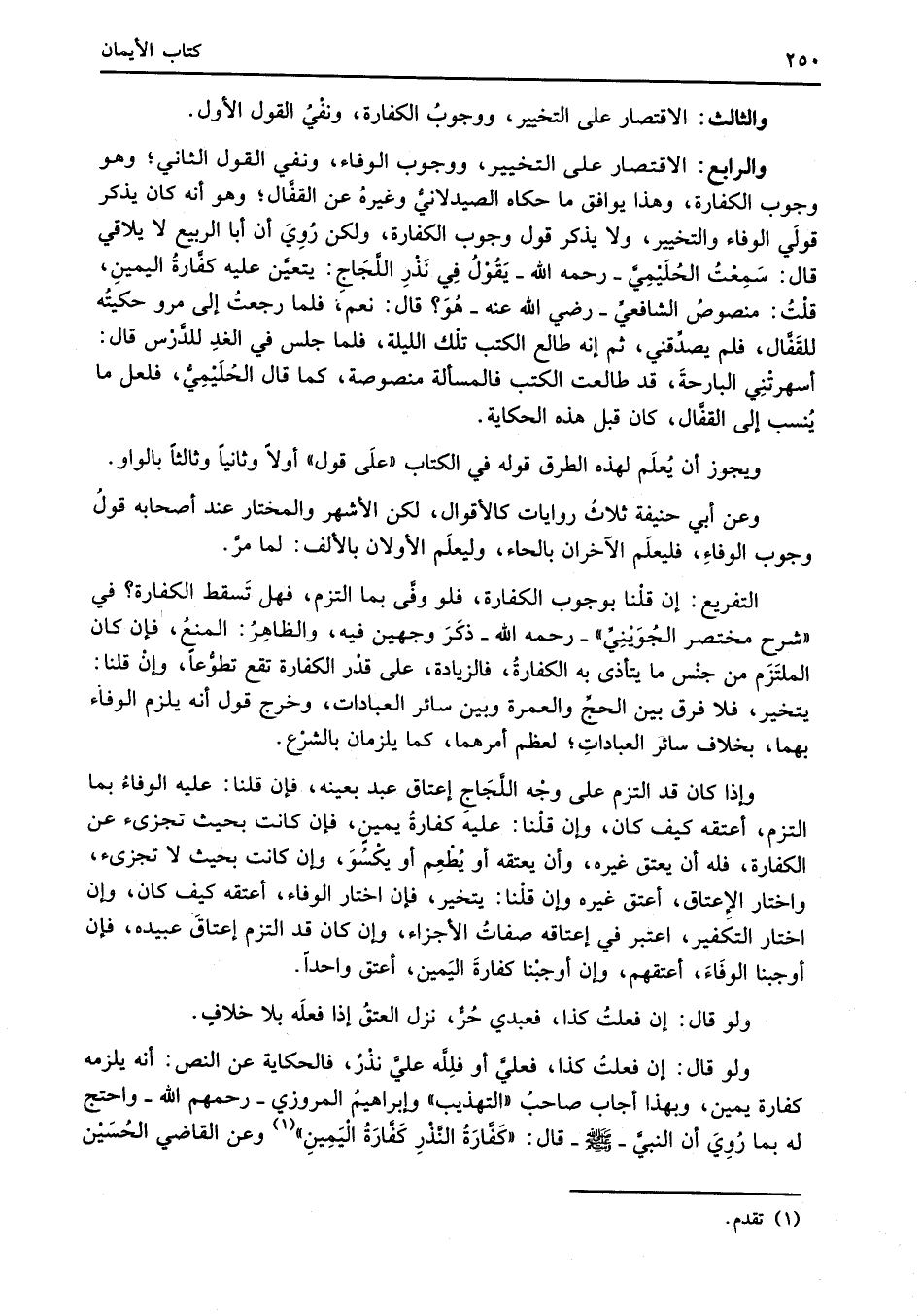 والرابع: الاقتصار على التخيير، ووجوب الوفاء، ونفي القول الثاني؛ وهو وجوب الكفارة، وهذا يوافق ما حكاه الصيدلانيُّ وغيرة عن القفَّال؛ وهو أنه كان يذكر قولَي الوفاء والتخيير، ولا يذكر قول وجوب الكفَّارة، ولكن رُوِيَ أن أبا الربيع لا يلاقي قال: سَمِعْتُ الحُلَيْمِيَّ -رحمه الله- يَقُوْلُ فِي نَذْرِ اللَّجَاج: يتعيَّن عليه كفَّارةُ اليمينِ، قلت: منصوصُ الشَّافعي -رضي الله عنه- هُوَ؟ قال: نعم، فلما رجعتُ إلى مرو حكيتُه للقَفَّال، فلم يصدِّقني، ثم إنه طالع الكتب تلْك الليلة، فلما جلس في الغدِ للدَّرْس قال: أسهرتْنِي البارحةَ، قد طالعت الكتب فالمسألة منصوصة، كما قال الحُلَيْمِيُّ فلعل ما يُنسب إلى القفَّال، كان قبل هذه الحكاية.