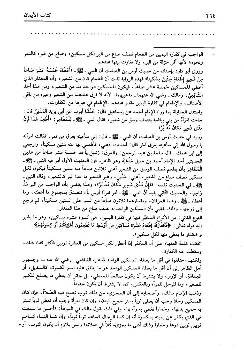 وروى أبو داود بإسناده من حديث أوس بن الصامت أن النبي -صلى الله عليه وسلم- "أَعْطَاهُ خَمْسَةَ عَشْرَ صَاعاً مِنْ شَعِيرٍ إِطْعَامَ سِتِّينَ مِسْكيناً" فهذه الرواية تثبت أن الطعام كان من الشعير، وأن المقدار الذي أعطي للمساكين خمسة عشر صاعاً، فيكون للمسكين الواحد مد من الشعير، ومن هذا أخذ الشَّافِعِيُّ، ومالك -رضي الله عنهما- مذهبيهما؛ لأنه لا فرق عندهما بين الشعير وغيره من باقي الأصناف، والإِطعام في كفارة اليمين مقدر عندهما بالإِطعام في غيرها من الكفارات.