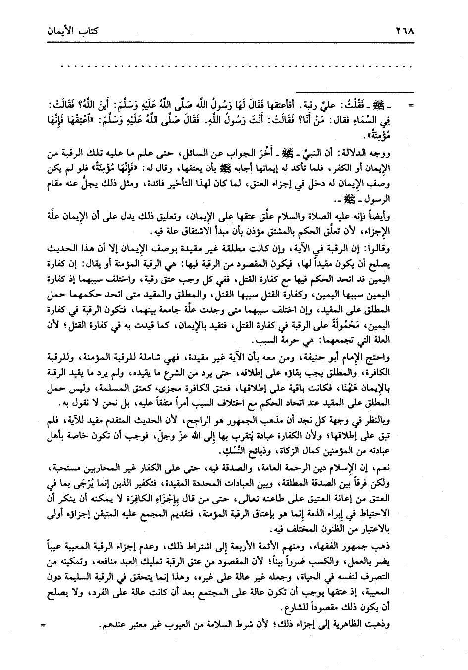 ووجه الدلالة: أن النبي -صلى الله عليه وسلم- أَخَّرَ الجواب عن السائل، حتى علم ما عليه تلك الرقبة من الإِيمان أو الكفر، فلما تأكد له إيمانها أجابه -صلى الله عليه وسلم- بأن يعتقها، وقال له: "فَإنَّهَا مُؤمِنَةٌ"، فلو لم يكن وصف الإِيمان له دخل في إجزاء العتق، لما كان لهذا التأخير فائدة، ومثل ذلك يجلُّ عنه مقام الرسول -صلى الله عليه وسلم-.