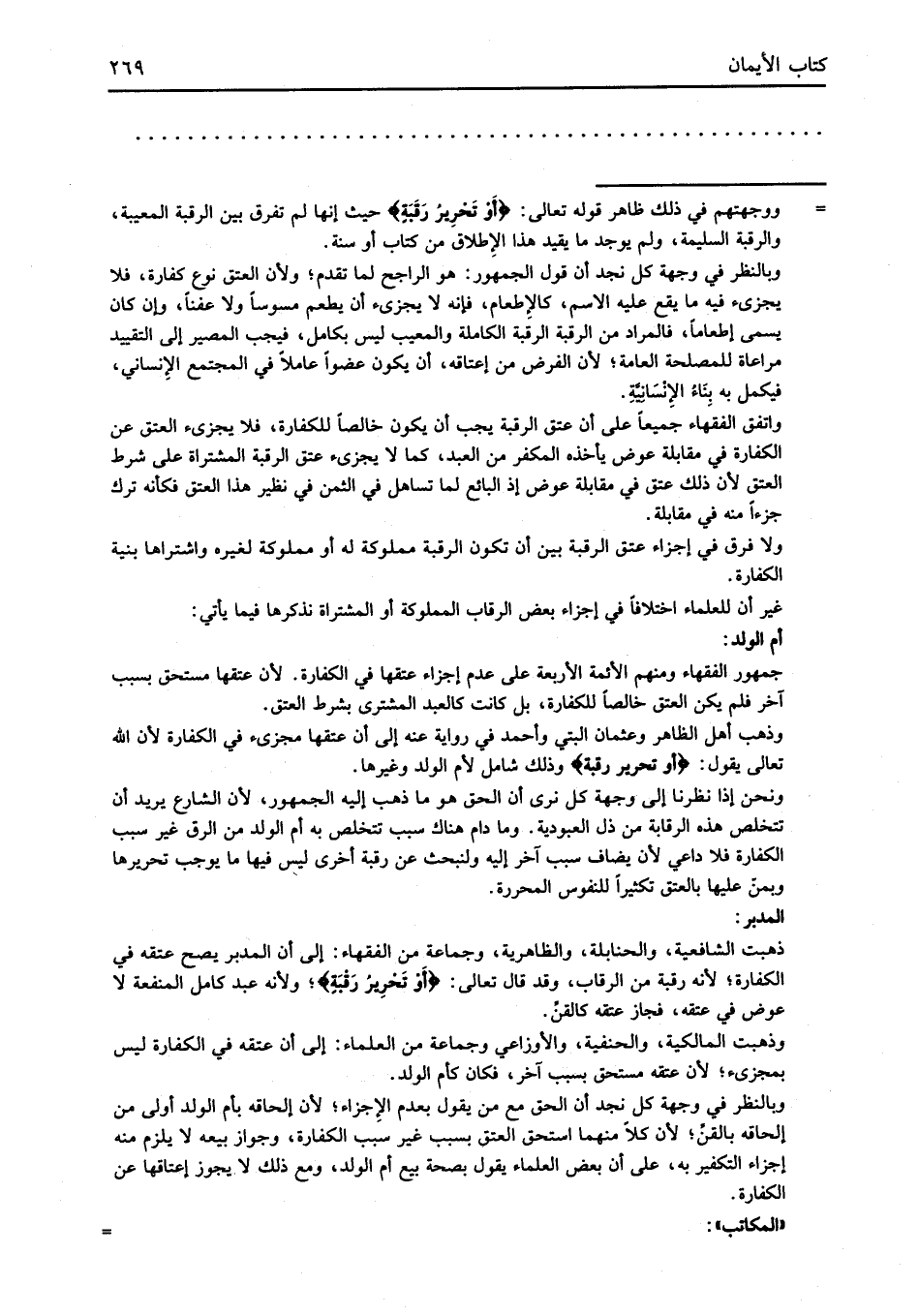 ونحن إذا نظرنا إلى وجهة كل نرى أن الحق هو ما ذهب إليه الجمهور, لأن الشارع يريد أن تتخلص هذه الرقابة من ذل العبودية. وما دام هناك سبب تتخلص به أم الولد من الرق غير سبب الكفارة فلا داعي لأن يضاف سبب آخر إليه ولنبحث عن رقبة أخرى ليس فيها ما يوجب تحريرها وبمنّ عليها بالعتق تكثيرا للنفوس المحررة.