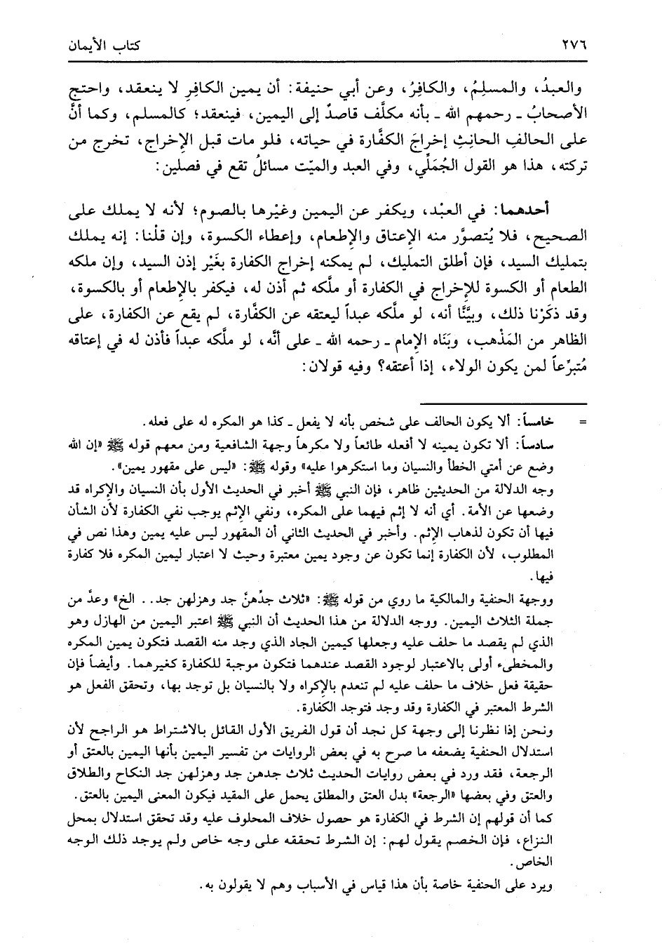 والعبدُ، والمسلِمُ، والكافِرُ، وعن أبي حنيفة: أن يمين الكافِرِ لا ينعقد، واحتج الأصحابُ -رحمهم الله- بأنه مكلَّف قاصدٌ إلى اليمين، فينعقد؛ كالمسلم، وكما أنَّ على الحالفِ الحانِثِ إخراجَ الكفَّارة في حياته، فلو مات قبل الإِخراج، تخرج من تركته، هذا هو القول الجُمَلِّي، وفي العبد والميّت مسائلُ تقع في فصلين: